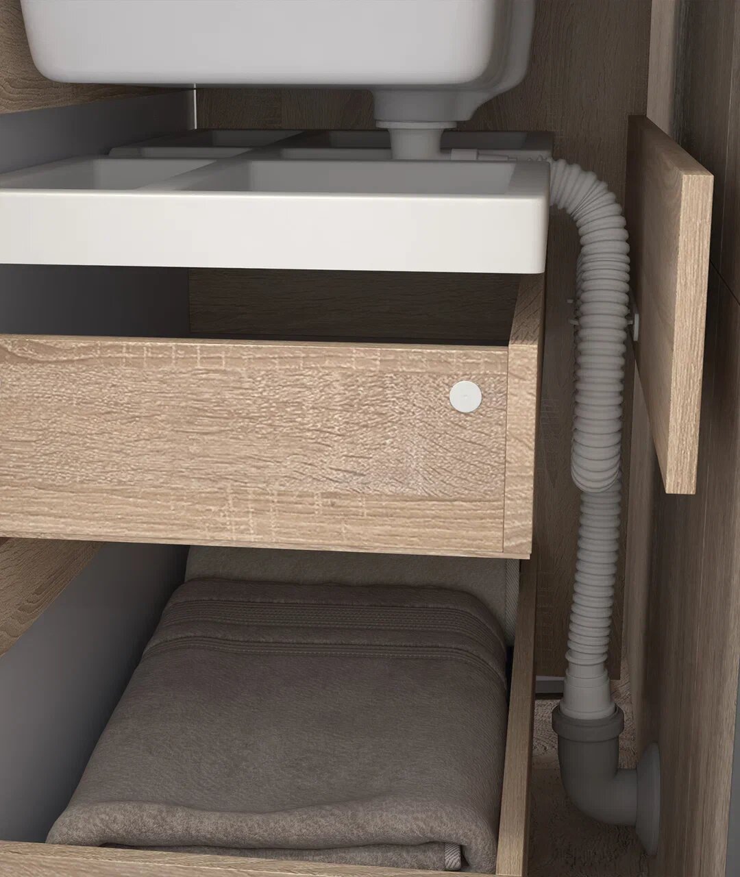 Хорошая качественная тумба с продуманным дизайном. В верхнем отделе есть выдвижной ящичек для хранения мелких вещей, удобная полка и место для коммуникаций. Выдвижной ящик небольшой, но для хранения полотенец и запасов мыла хорошо подходит. За такую приятную цену просто подарок!