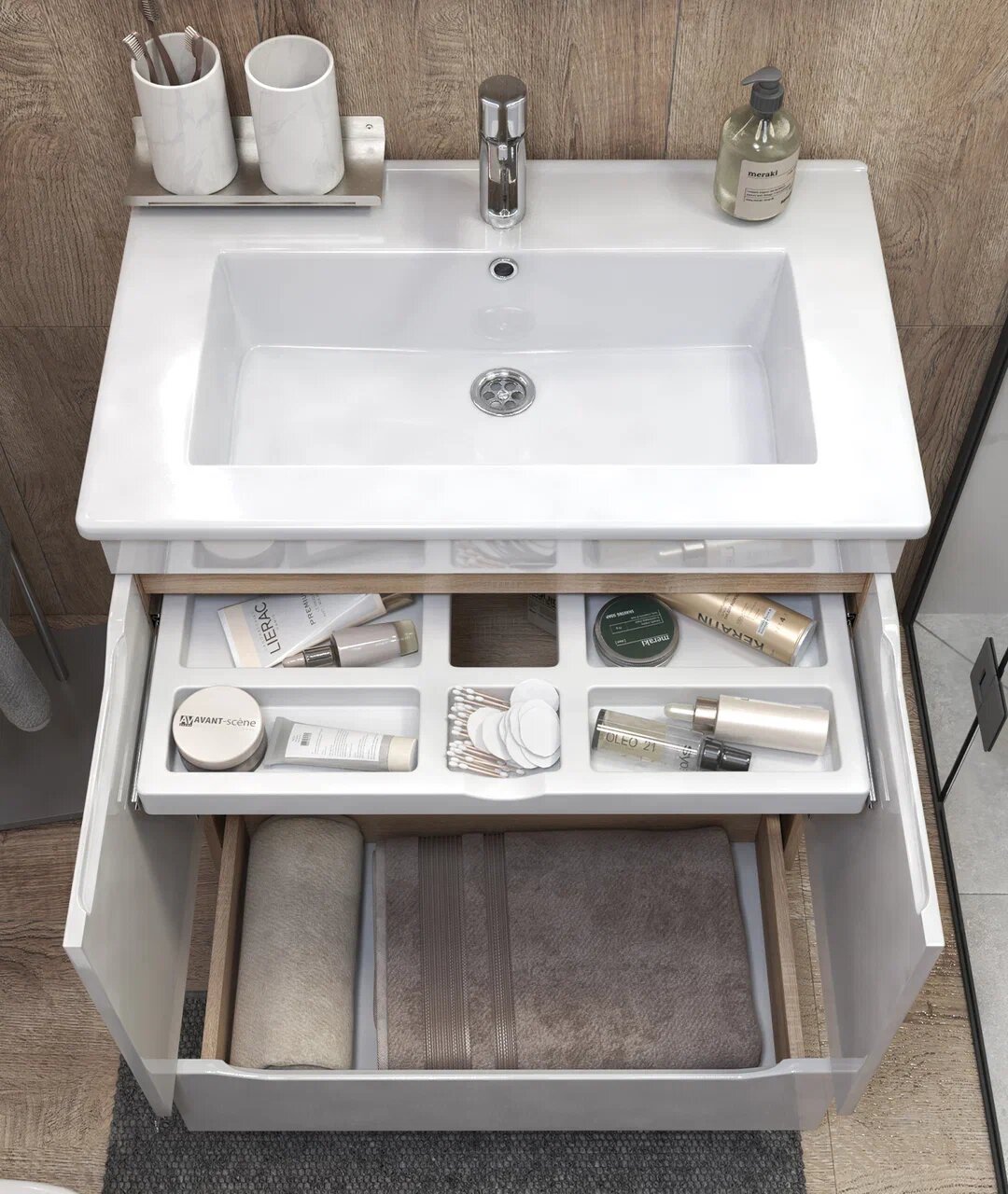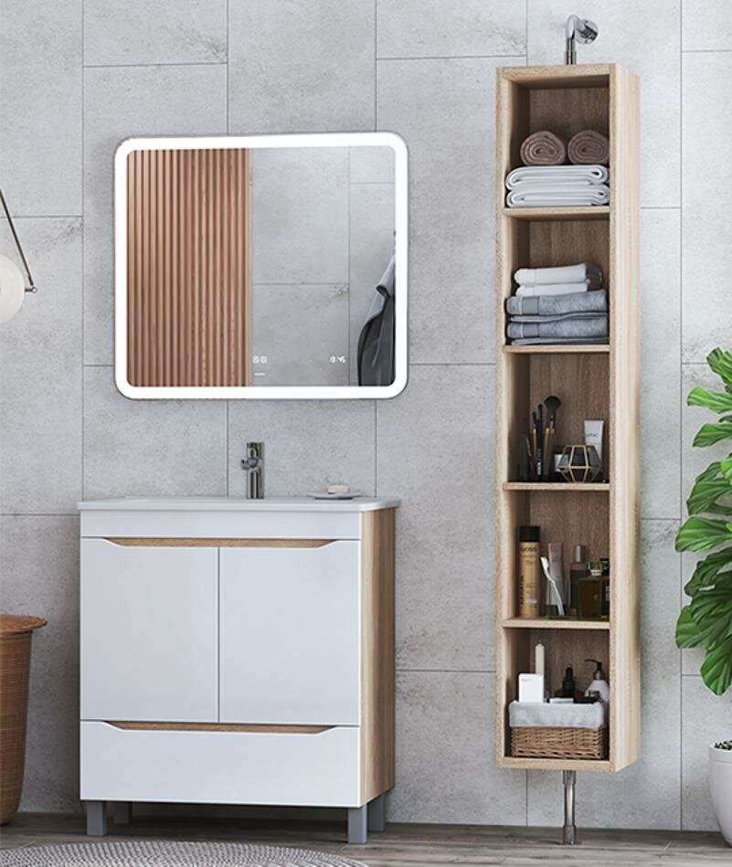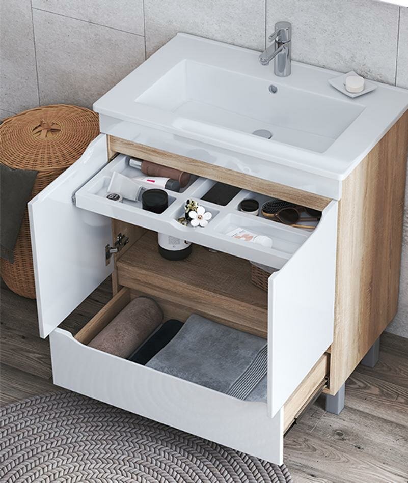 Оригинальная и интересная тумба, а не обычный мойдодыр. Стильный внешний вид, приятный цвет корпуса (под дерево) и белый глянцевый фасад. Внутри есть и полка, скрытая за дверками и дополнительный ящик. Особой находкой стал для меня выдвижной ящичек сверху, в который помещается море моей косметики. Все надежное, качество на уровне, ящик ходит плавно и дверки не хлопают. Одним словом советую!