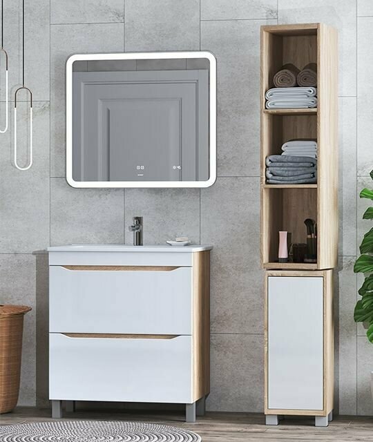Очень стильная тумбочка по хорошей цене. Красивое сочетание цветов, впишется в любой интерьер. Внутри много места для хранения. И радует, что есть ящик и на верхней полке выдвижное отделение для всяких мелочей. Вот на полках удобно хранить высокие бутылки со средствами. А в ящике храню полотенца. Вместила все необходимое. По качеству отличная, за месяцы использования никаких нареканий.