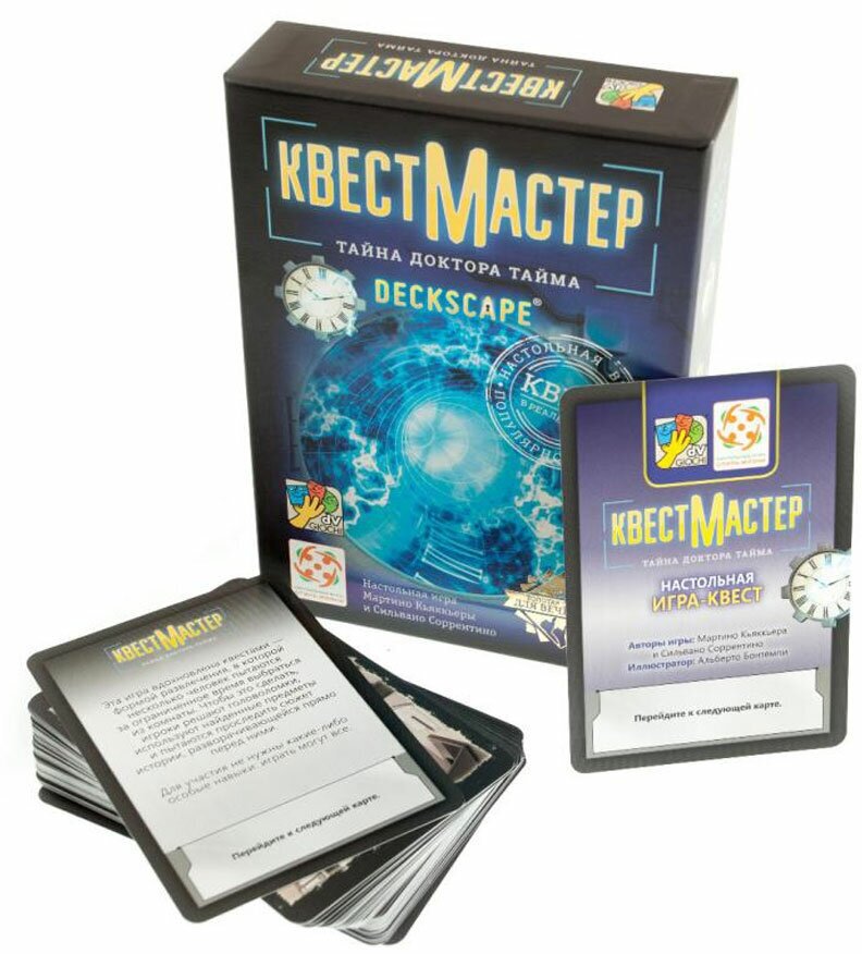 Тайна доктора Тайма Перед вами игра, которая особенно подойдет для тех, кому нравится загадки и квесты. Если вам понравится данный экземпляр, то настоятельно рекомендуем познакомиться с еще одним в этой серии – с Судьбой Лондона, или же более масштабным Агентством время. По сюжету вы оказываетесь в засекреченной лаборатории, из которой необходимо выбраться за один час реального времени, иначе над вами попытаются провести некоторые эксперименты. Для подготовки вам потребуются часы, ручка, лист и просто достать стопку карт из коробки (просматривать заранее и перемешивать их запрещено), начните с первой из них и действуйте по изложенным предписаниям. Как и в обычной квест-комнате найденные ответы пригодятся вам на следующих этапах, а обнаруженные предметы часто пригодятся и в дальнейшем. Если ваша команда зайдет в тупик, игра КвестМастер предусматривает карты подсказки, цель которых натолкнуть вас на верный путь.