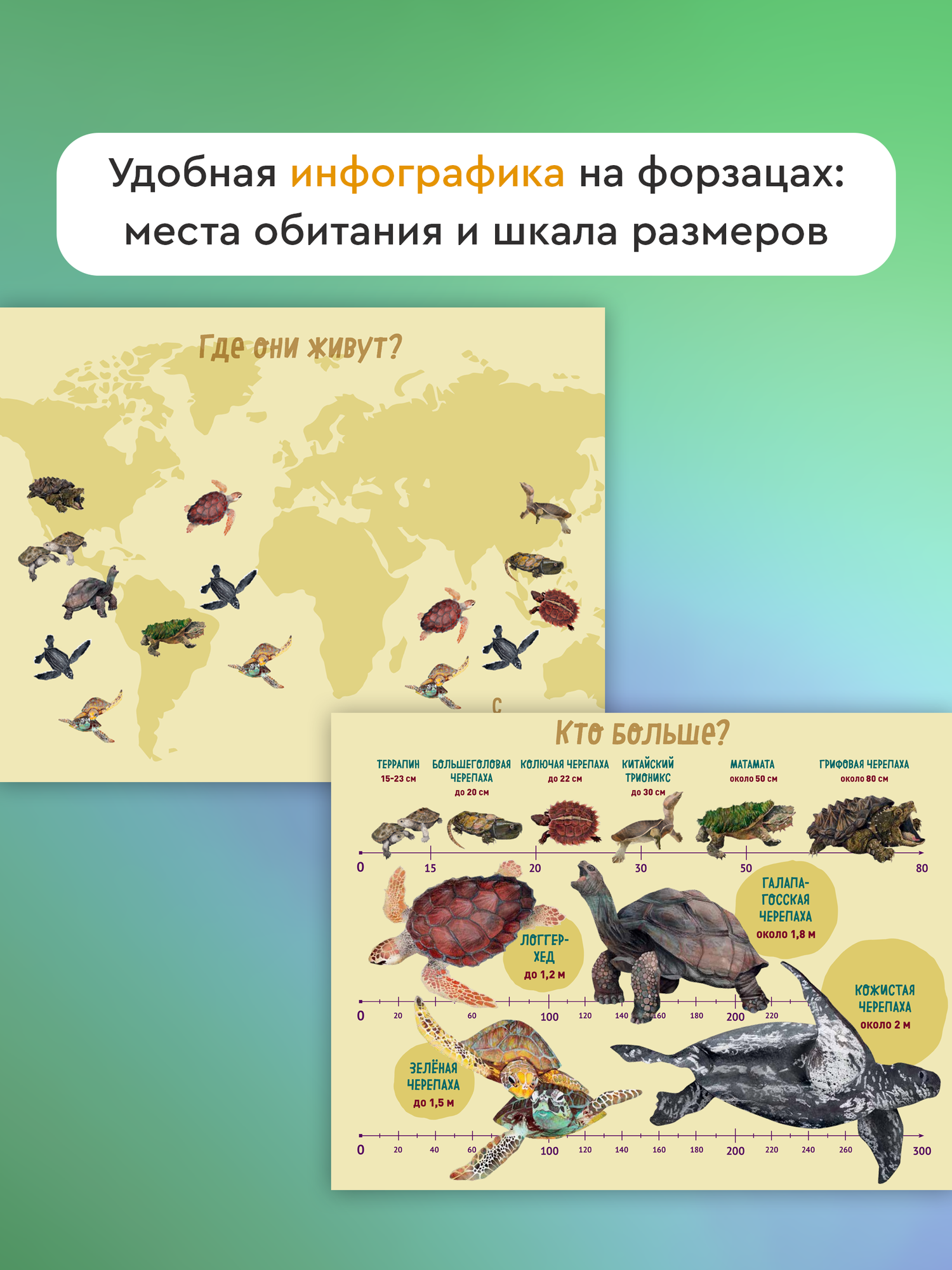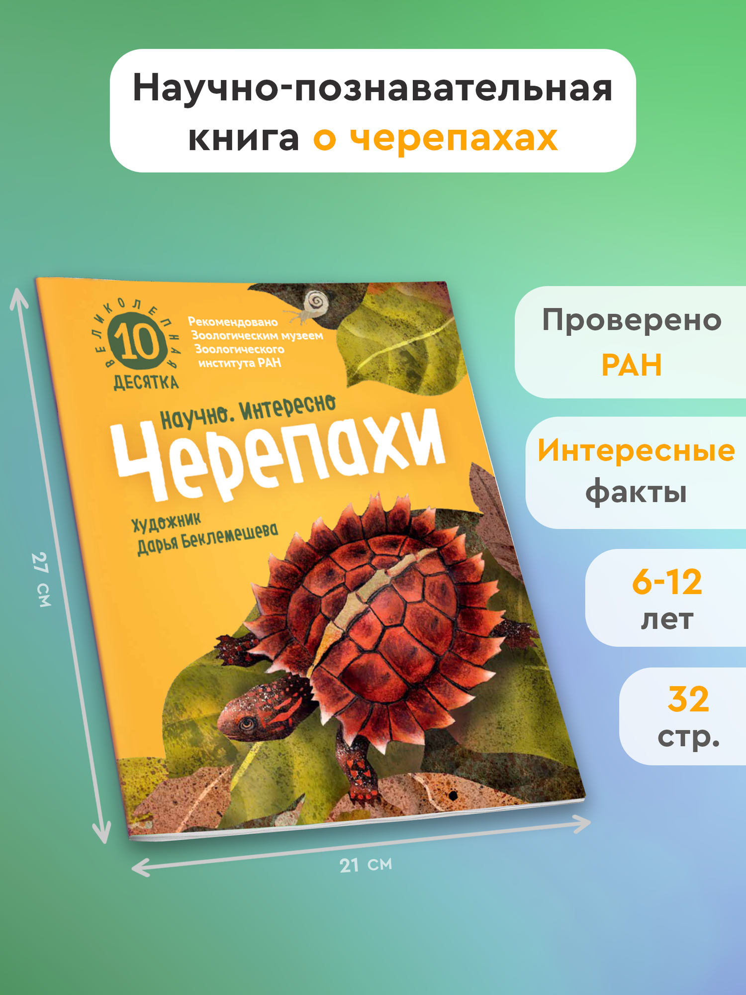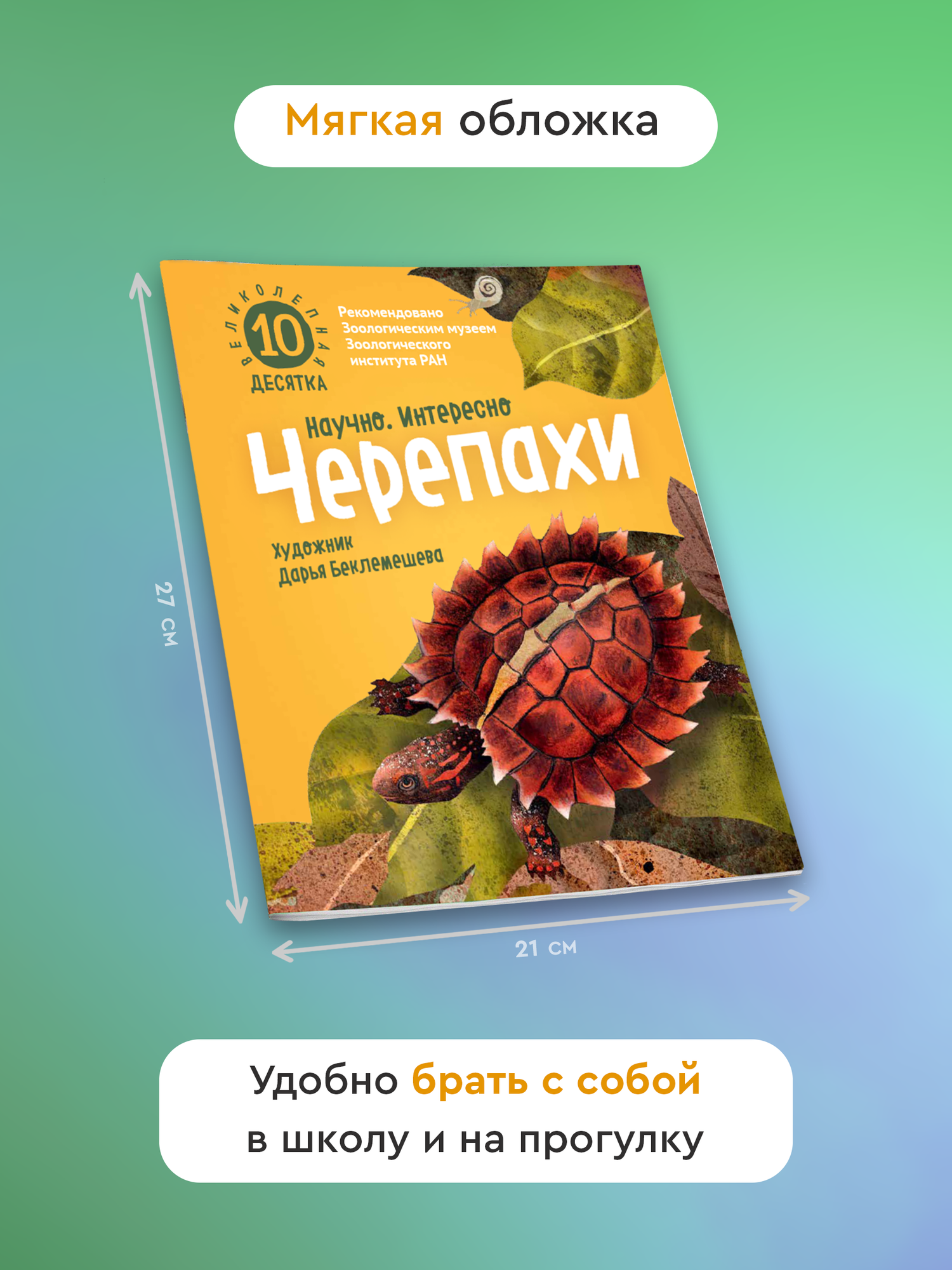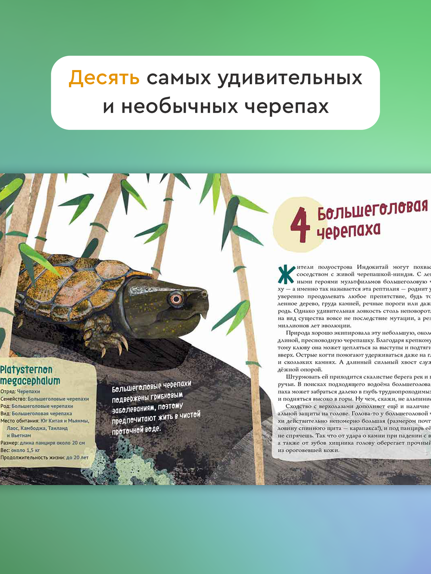 Эта книга посвящена самым удивительным черепахам мира. Оказывается, не все черепахи медлительны: многие из них прекрасные пловцы, а некоторые умеют быстро бегать. У одних спину прикрывает мощный панцирь, у других – лёгкий кожный щит. Одни помещаются на ладони, а другие весят как небольшой автомобиль. Но все они очень интересны и неповторимы. На страницах этой книги вы познакомитесь с логгерхедом, китайским триониксом, террапином, матаматой и другими черепахами из нашей ВЕЛИКОЛЕПНОЙ ДЕСЯТКИ!