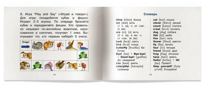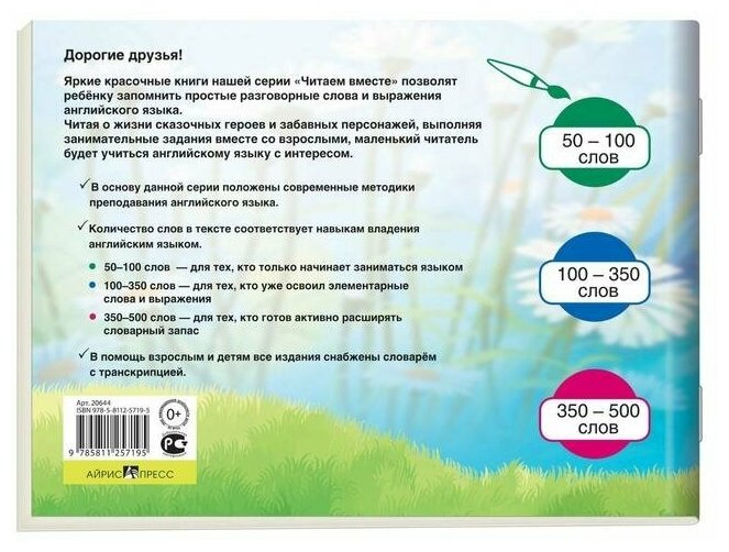 Отличная книга для изучения английского языка. Подойдет как деткам, так и взрослым. Текст простой, понятный, что очень важно на начальной ступени. Шрифт крупный, красивые и яркие картинки - большой плюс для малышей, да и взрослому глазу приятно.) В конце книжки словарик , где имеются все более ли менее сложные слова из текста. Также есть задания в игровой форме. Сама книжка не большая как по размеру, так и по объёму.