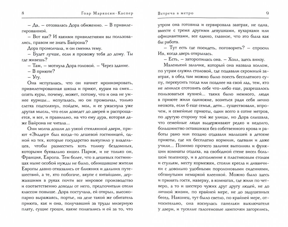 Книга "Встреча в метро" включает в себя роман "Париж был так прекрасен…", номинированный на Букеровскую премию, и двенадцать новелл. Отношения художника и его натурщицы развиваются на фоне парижской жизни. Но Париж не фон, он – участник событий. Именно ему в романе угрожает опасность. Удар наносится по ландшафту европейской культуры: музеям, памятникам, соборам. И это, как полагает Гоар Маркосян-Каспер, гораздо опаснее. Если Парижа не будет – во имя чего тогда жить?