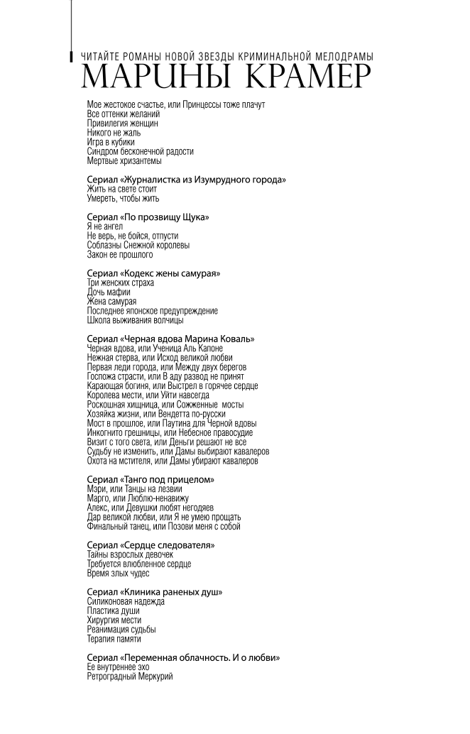 | Серия | Закон сильной. Криминальное соло Марины Крамер |