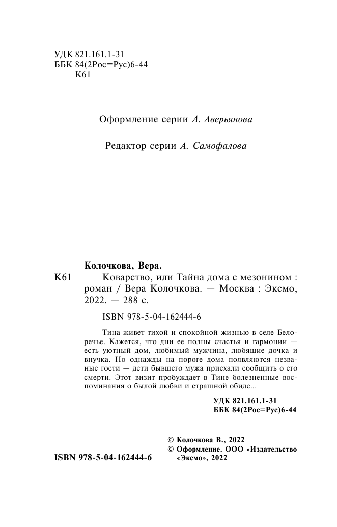 Коварство или Тайна дома с мезонином (Колочкова Вера Александровна); Эксмо, Редакция 1, 2022