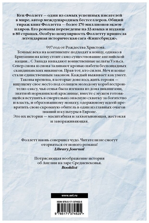 Ещё один томик Фоллетта на полке. Смотрится очень красиво. Оформление обложки великолепное. Роман захватывает с первых страниц. К тому же это предистория Столпов земли. С нетерпением жду новых книг в этой серии. Один минус это типографская бумага, если бы офсет то можно было бы с уверенностью советовать и как подарок.