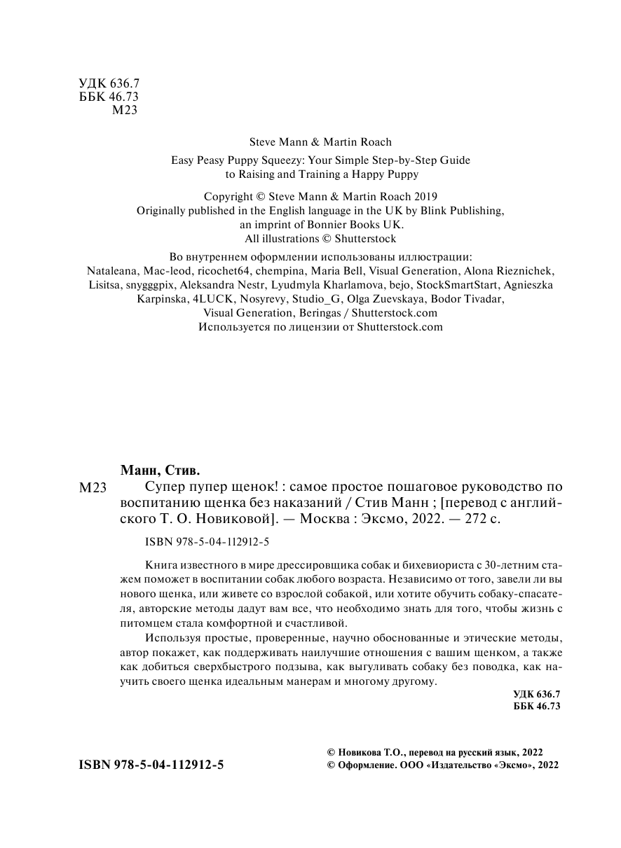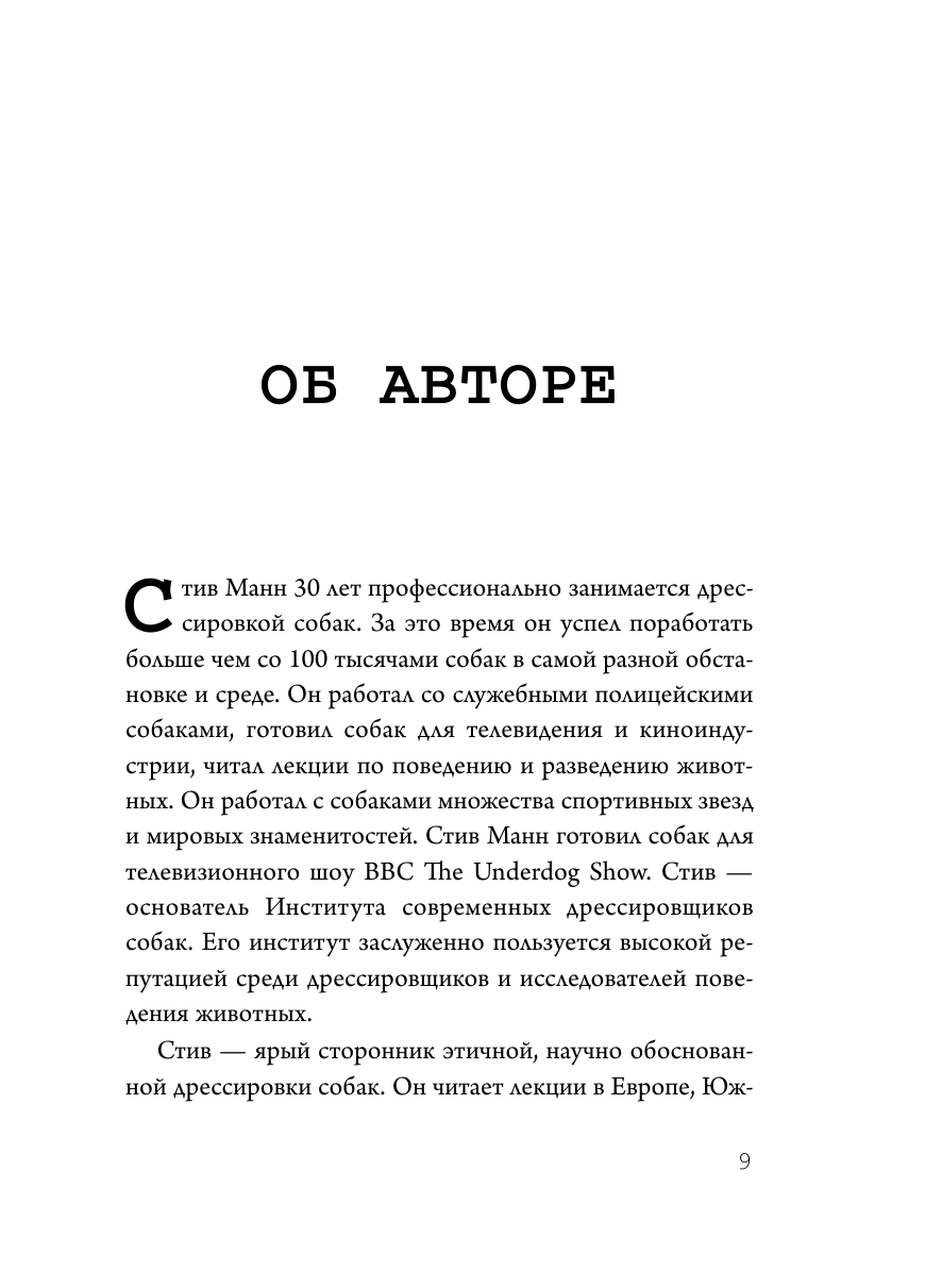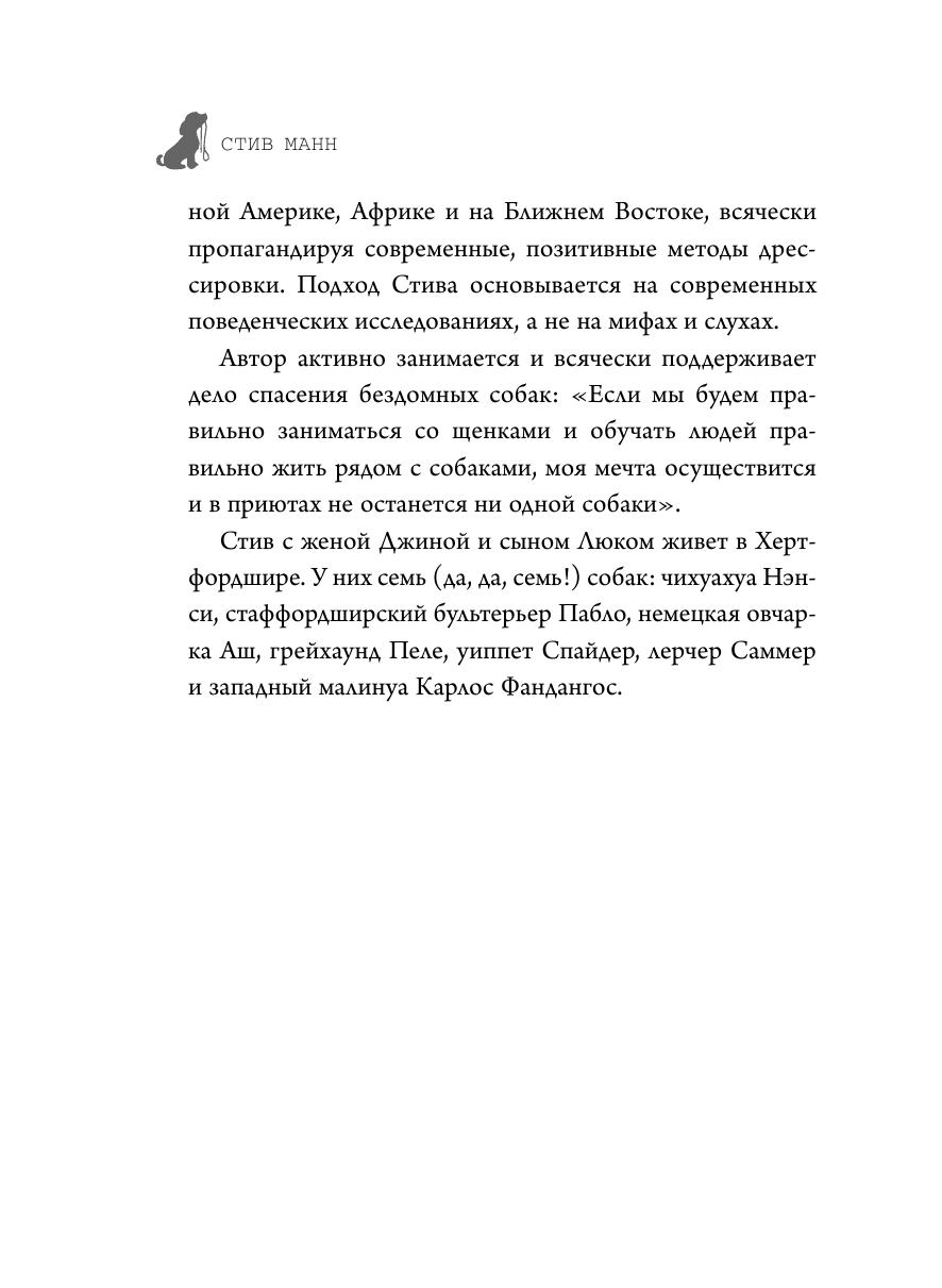 Используя простые, проверенные, научно обоснованные и этические методы, автор покажет, как поддерживать наилучшие отношения с вашим щенком и сделать вашу жизнь комфортной и счастливой. Стив Манн 30 лет профессионально занимается дрессировкой собак. За это время он успел поработать больше чем со 100 тысячами собак в самой разной обстановке и среде. Он работал со служебными полицейскими собаками, готовил собак для телевидения и киноиндустрии, читал лекции по поведению и разведению животных. Он работал с собаками множества спортивных звезд и мировых знаменитостей. Стив Манн готовил собак для телевизионного шоу BBC The Underdog Show. Стив — основатель института современных дрессировщиков собак. Его институт пользуется заслуженно высокой репутацией среди дрессировщиков и исследователей поведения животных.