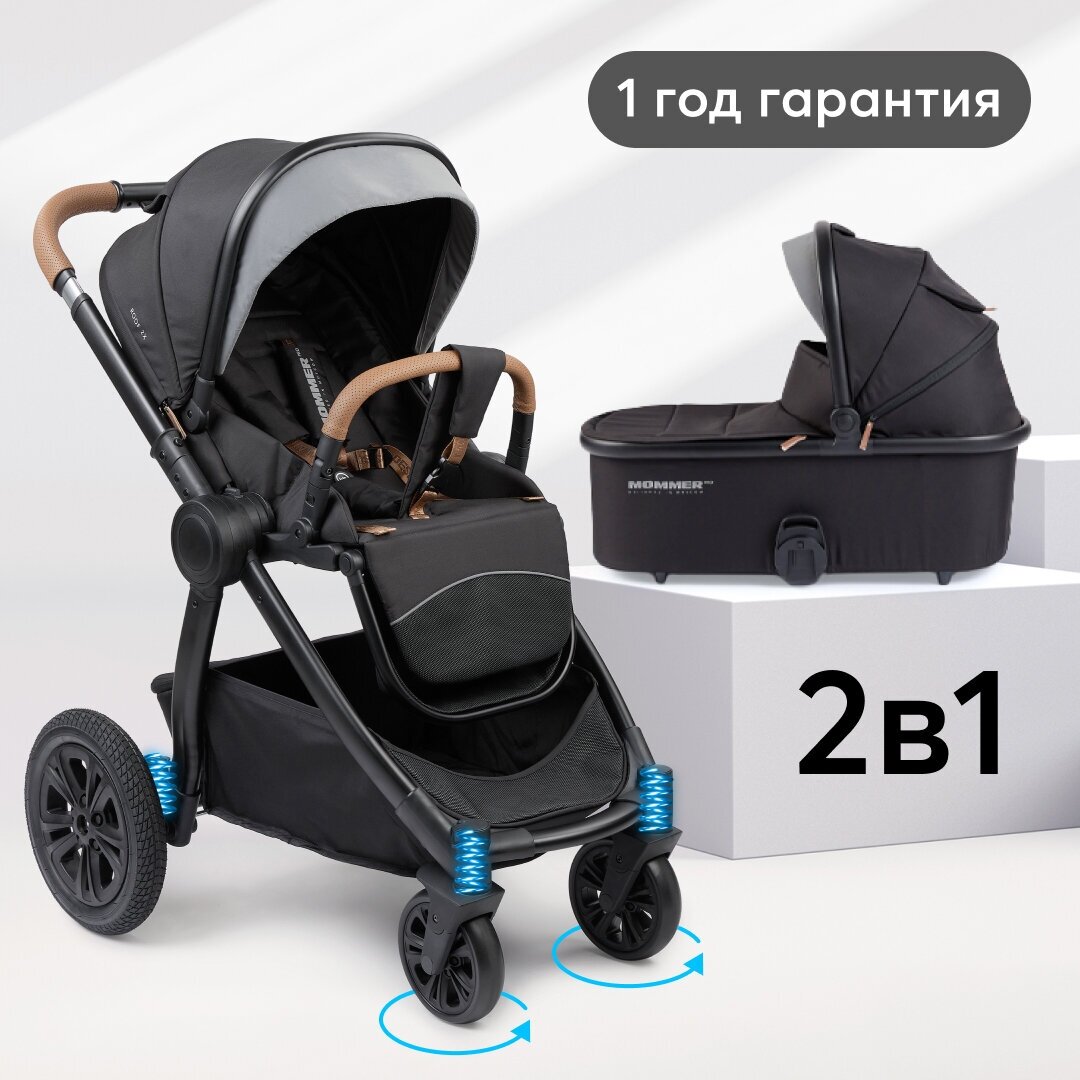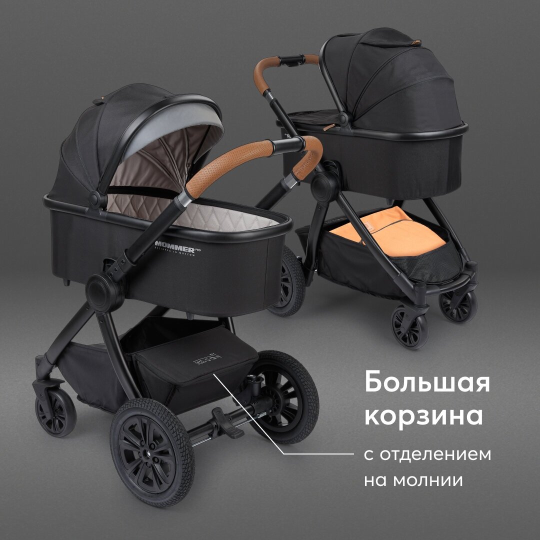 MOMMER PRO - коляска 2 в 1 для детей с рождения, оснащенная просторной люлькой и комфортным прогулочным блоком.Блок-люлька для новорождённых оснащён удобной ручкой для переноски. Большой капюшон защитит от солнца, а смотровое окошко поможет наблюдать за ребёнком.Прогулочный блок оснащён капюшоном до бампера. Бампер с разделителем для ног и пятиточечные ремни с мягкими накладками надёжно фиксируют малыша в коляске. Угол наклона блока, положение спинки и подножки можно отрегулировать.Каждый блок устанавливается лицом к родителям или по ходу движения.Гулять с MOMMER PRO удобно и маме, и папе - телескопическая ручка настраивается на нужную длину. Амортизация на задних и передних колёсах обеспечит комфорт даже на бездорожье. Надёжные надувные колёса легко подкачать обычным насосом. Большая корзина вместит покупки и всё необходимое для прогулок.С MOMMER PRO комфорт и безопасность малыша под контролем