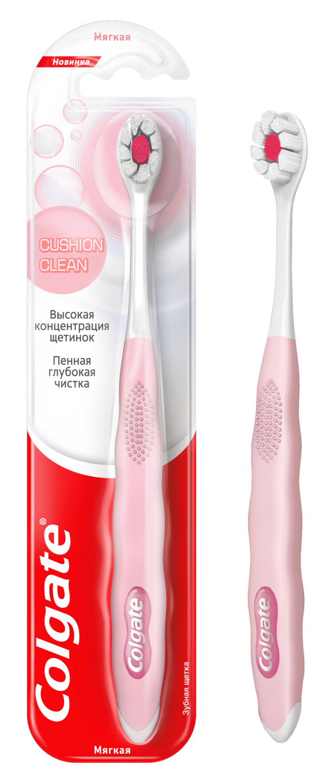 Зубная щетка Colgate Cushion Clean с мягкими щетинками, расположенными плотно друг к другу, образует больше пены для лучшего действия зубной пасты, а также оказывают мягкое и массирующее