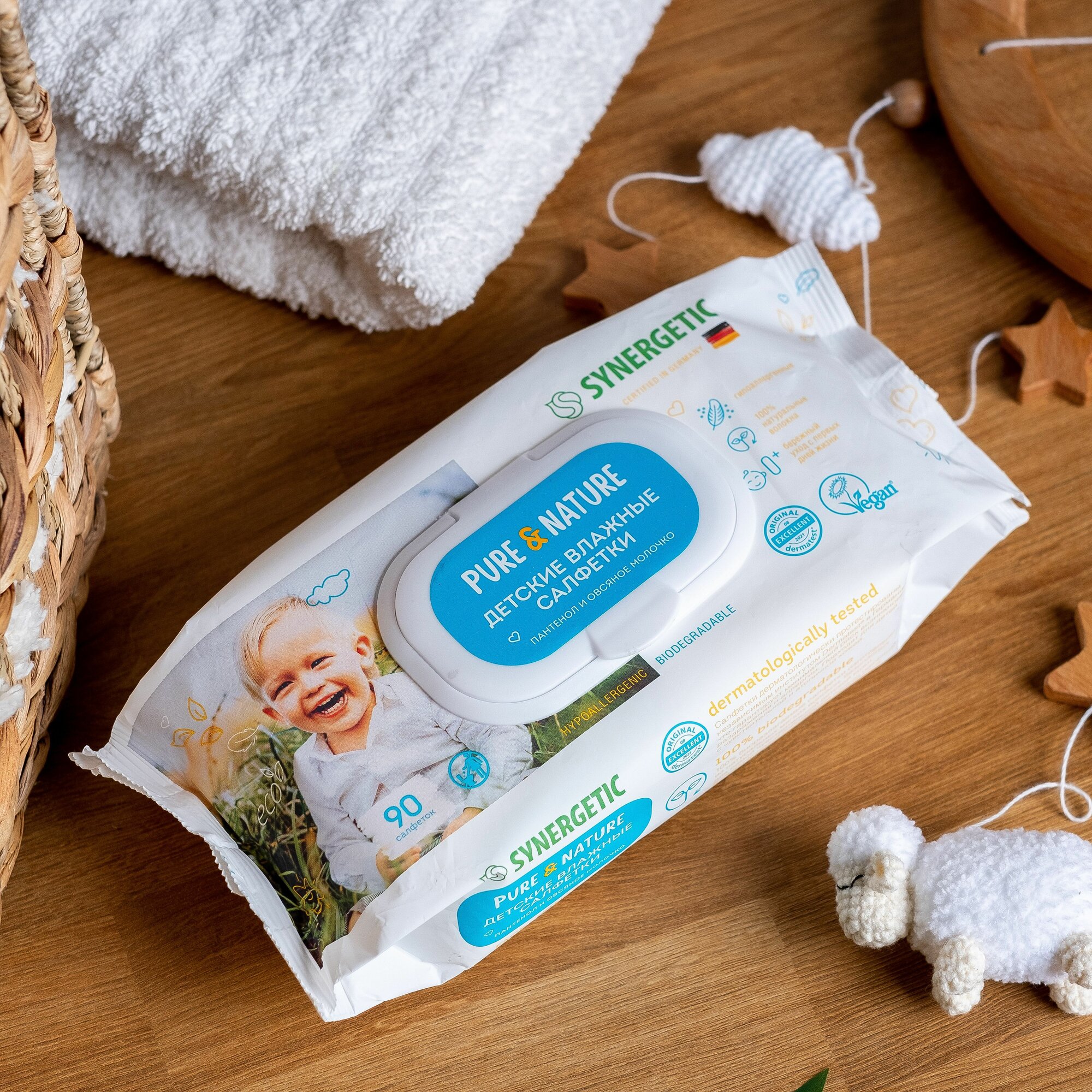 Гипоаллергенные биоразлагаемые салфетки SYNERGETIC Pure & Nature «Пантенол и овсяное молочко» из натуральных волокон эффективно очищают и ухаживают за кожей малыша с первых дней жизни.