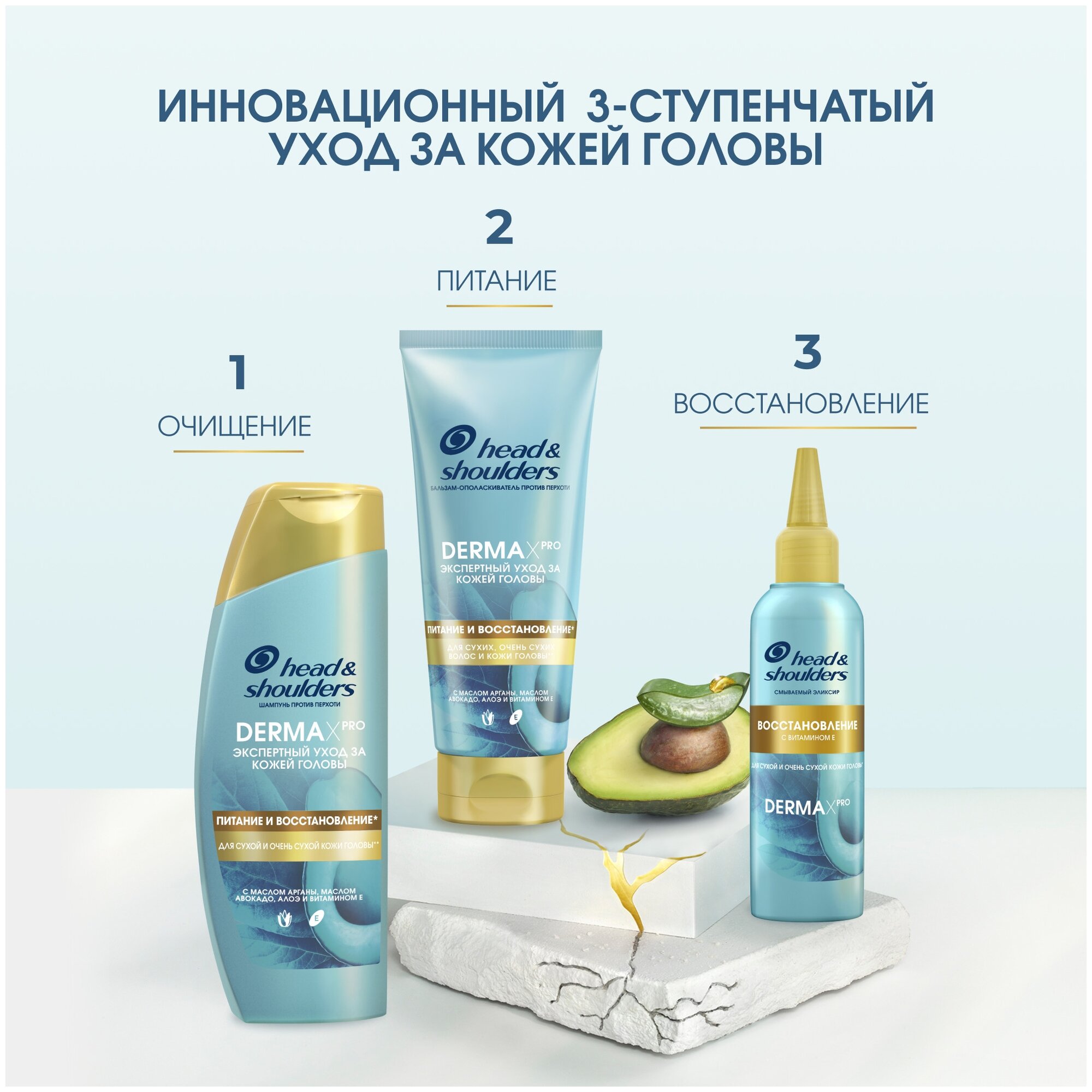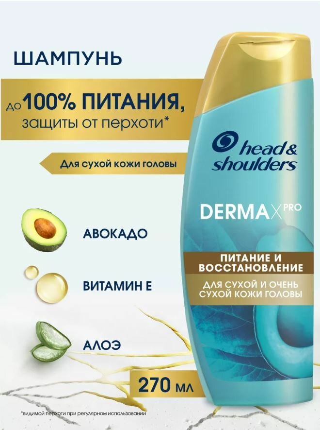 Революция в уходе за кожей головы! Экспертный трехступенчатый уход для питания кожи сухой головы и волос от Head & Shoulders (Хед энд Шолдерс) коллекция Derma X Pro. Сухой поврежденной коже не достаточно поверхностного увлажнения. Шампунь против перхоти Head & Shoulders Derma X Pro Питание и Восстановление помогает укрепить естественный защитный барьер кожи головы и восстановить pH баланс. Его клинически доказанная формула содержит питательные ингредиенты для ухода за кожей: масло авокадо, алоэ и витамин Е. Благодаря активному компоненту Пироктон Оламину шампунь эффективно борется с перхотью* и шелушением. Результат? Питание кожи головы и до 100% свободы от перхоти*. Используйте с бальзамом-ополаскивателем (шаг 2) и эликсиром для кожи головы (шаг 3) из коллекции Derma X Pro для наилучшего эффекта. *видимая перхоть при регулярном использовании.