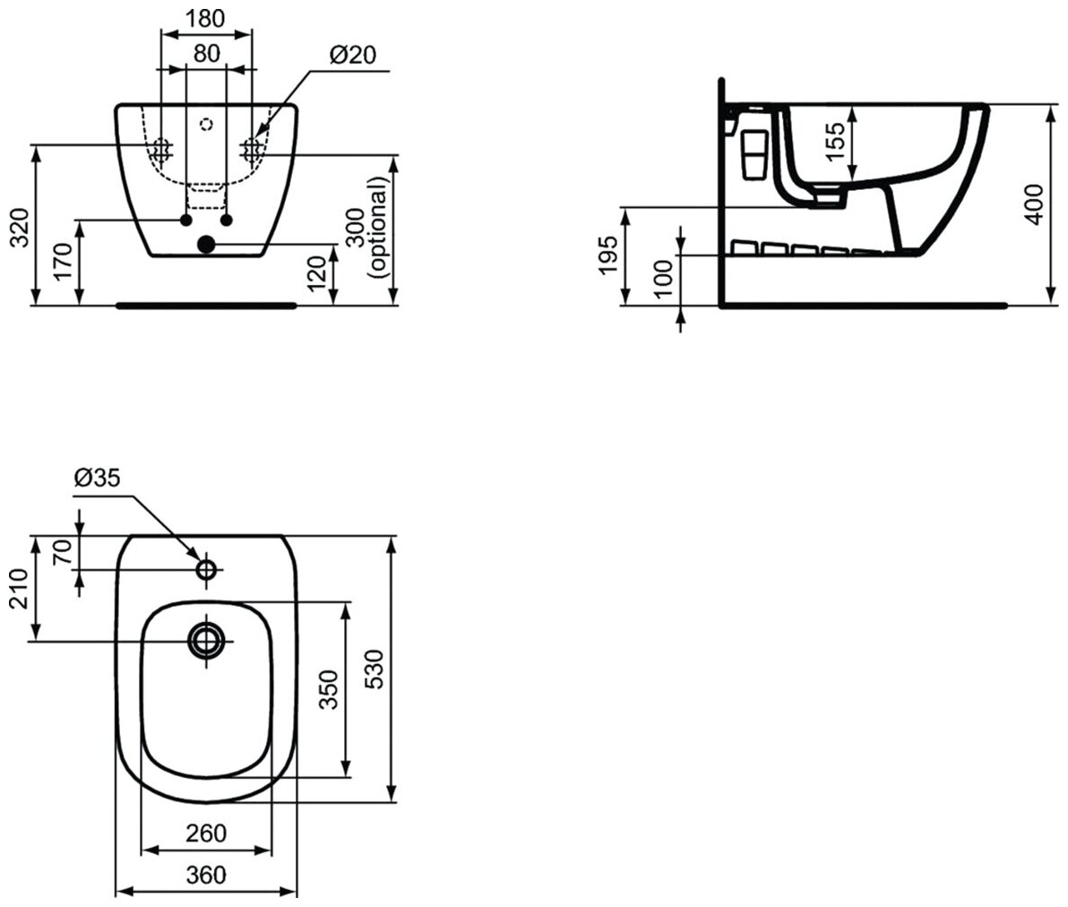 | Дополнительная информация | Подвесное биде, с отверстием под смеситель, с отверстием перелива, с крепежом TT0299598 (для полностью скрытого монтажа). |