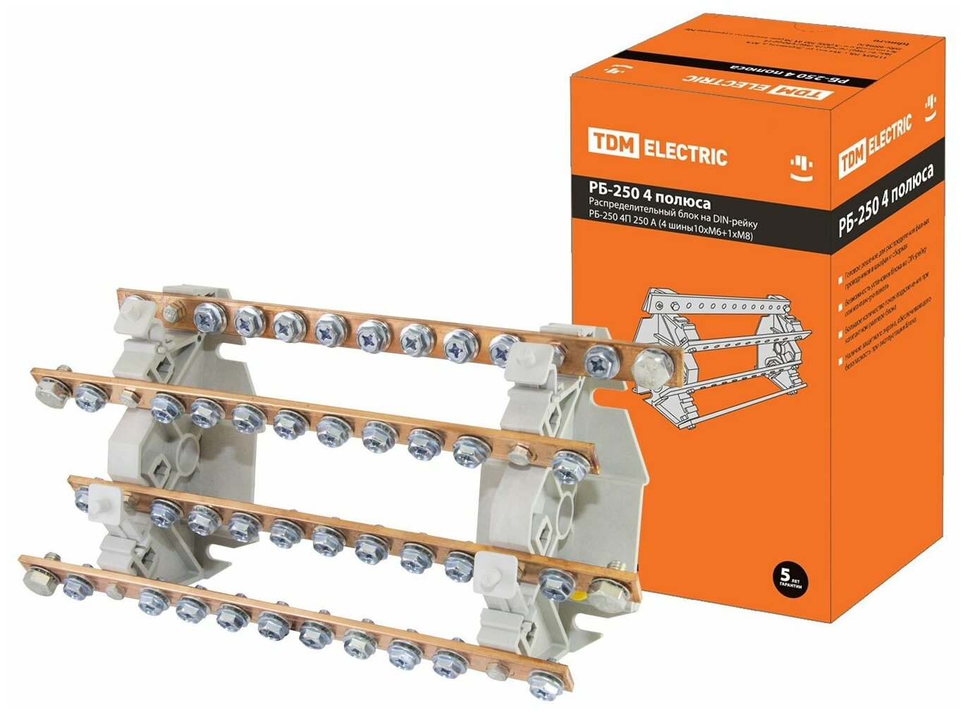 Высокоэффективный распределительный блок винтовой с количеством полюсов - 4 250 А марки TDM применяется в качестве клеммного зажима при присоединении к передатчику большего сечения нескольких проводников наименьшего сечения, для производства упорядоченных систем размещения в шкафах, для производства главной заземляющей шины при температуре окружающего воздуха от –40 до +70 °С. Корпус сделан из не поддерживающего горение пластика РА-66. Контактная группа блока произведена из луженой меди.