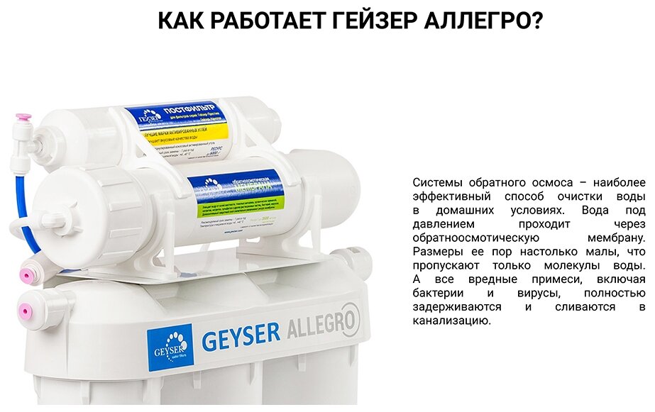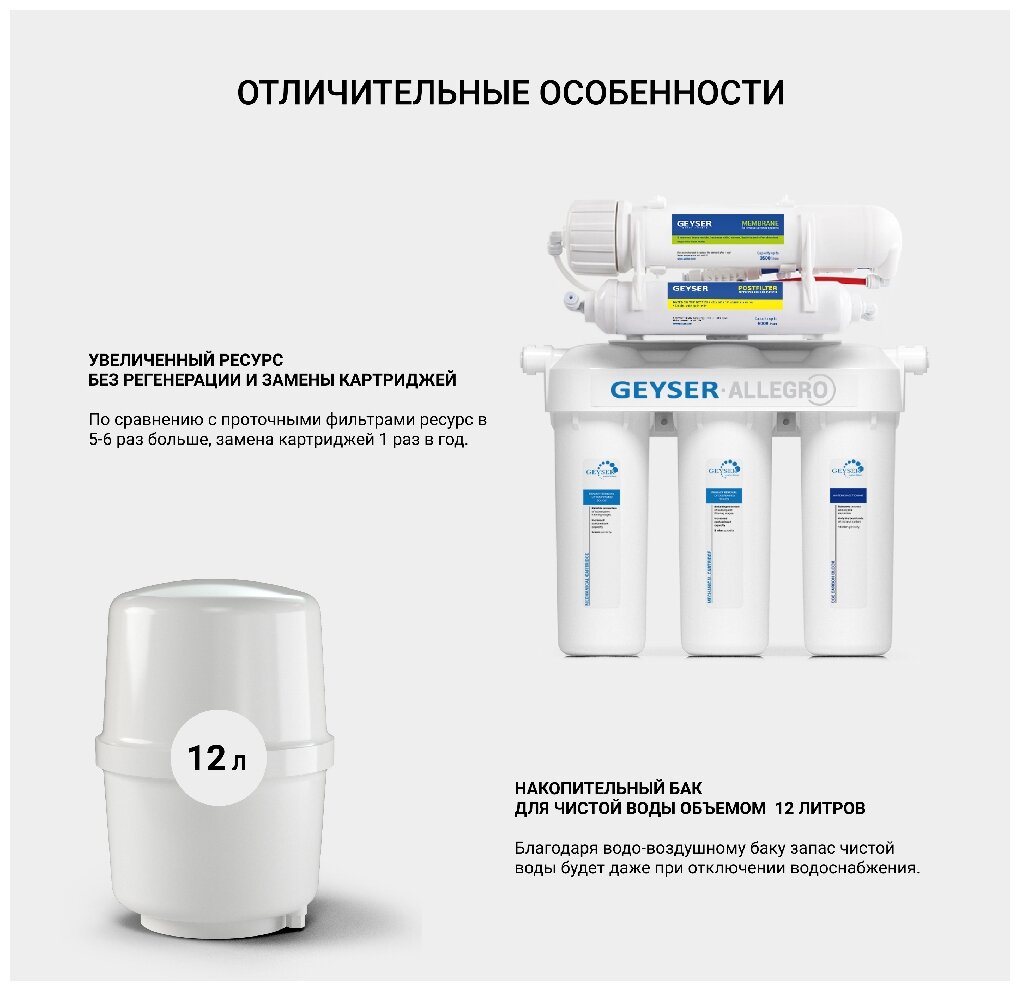 Обратноосмотический фильтр «Гейзер Аллегро» идеально очищает даже очень жесткую водопроводную воду. Для установки в напорной сети колбы имеют двойное уплотнение. Корпус выдерживает давление в 25 атмосфер и не менее 100 тысяч циклов гидроудара. Предусмотрен специальный клапан сброса воды в дренаж при сверхнормативном давления в гидроаккумуляторе. Работает при давлении в подводящей магистрали не менее 3 атм.