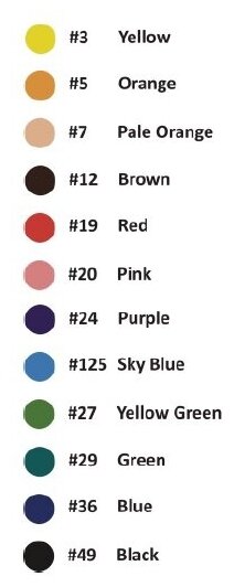 | Маркетинговый цвет | 20 Pink, 3 Yellow, 36 Blue, 7 Pale Orange, 27 Yellow Green, 24 Purple, 19 Red, 29 Green, 12 Brown, 5 Orange, 125 Sky Blue, 49 Black |