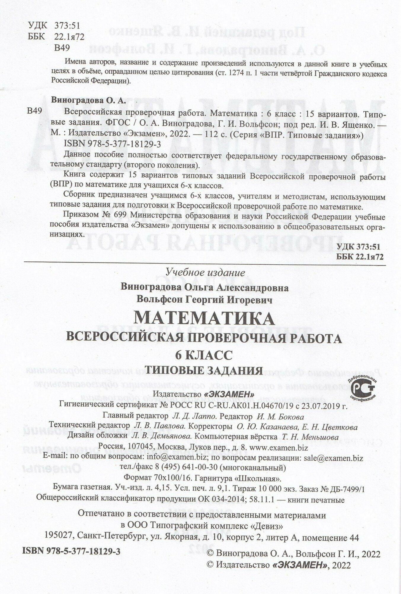 Математика Всероссийская проверочная работа 6 класс 15 вариантов Типовые задания Подробные критерии оценивания Ответы (Вольфсон Георгий Игоревич, Виноградова Ольга Александровна); Экзамен, 2022