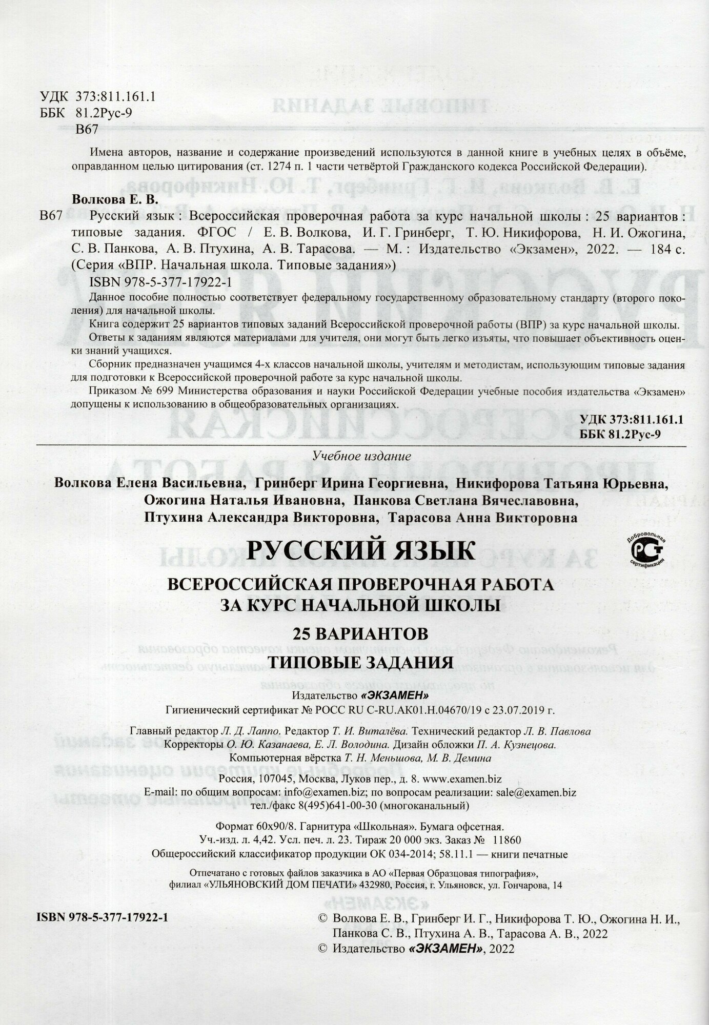Русский язык Всероссийская проверочная работа за курс начальной школы Типовые задания 25 вариантов заданий (Волкова Е. В., Гринберг И. Г., Никифорова Т. Ю., Ожогина Н. И., Панкова С. В., Птухина А. В., Тарасова А. В.); Экзамен, 2022