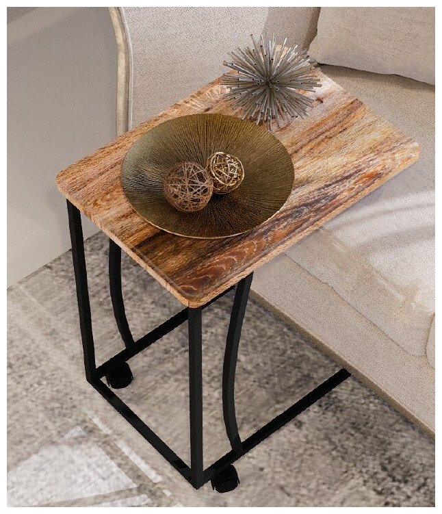 Журнальный столик выполнен в современном стиле, сочетающем оригинальную текстуру декоративного покрытия столешницы и металлического подстолья в цвете чёрный муару. Конструкция сборная.