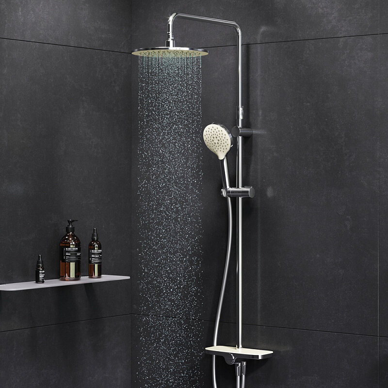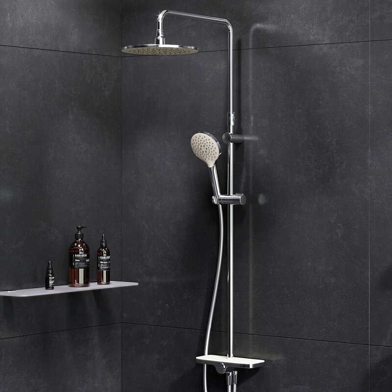 | Комплект поставки | душевая стойка; верхний душ; ручной душ; шланговое подключение; душевой шланг; держатель ручного душа; полочка |