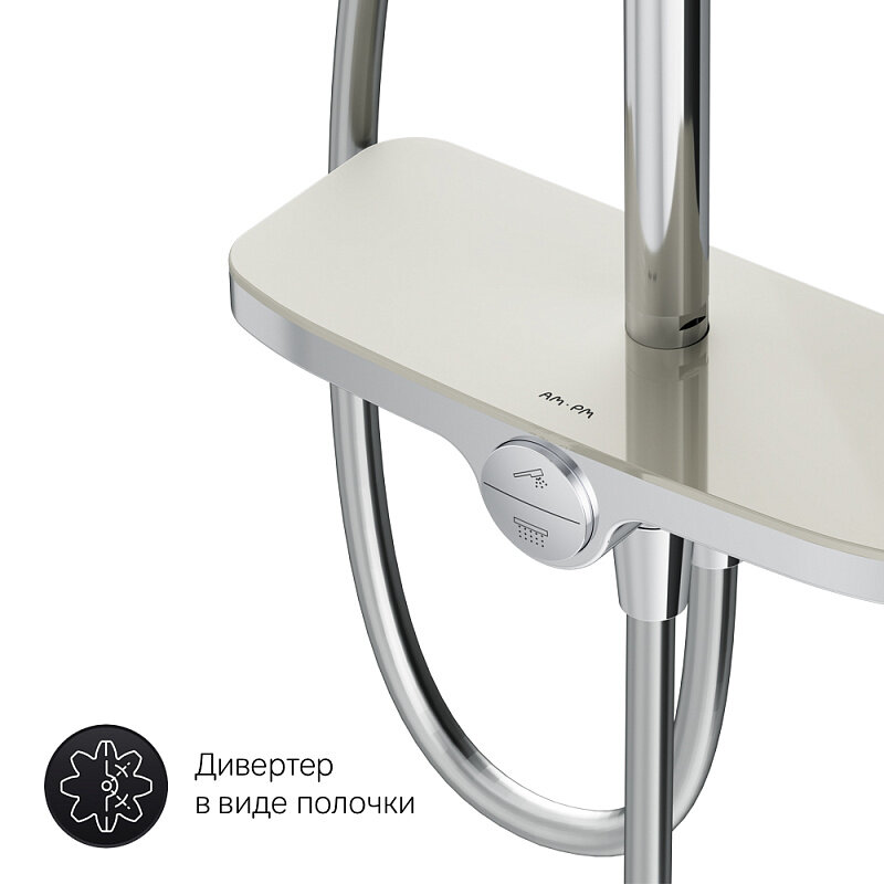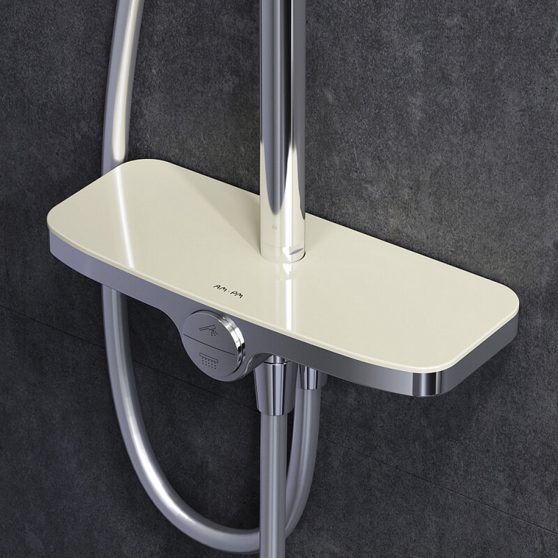 Нижнее крепление штанги выполнено в виде полочки, а переключатель верхний-ручной душ является ее продолжением. Нажав на него, вы можете менять источник потока воды от ручной лейки к верхнему душу.