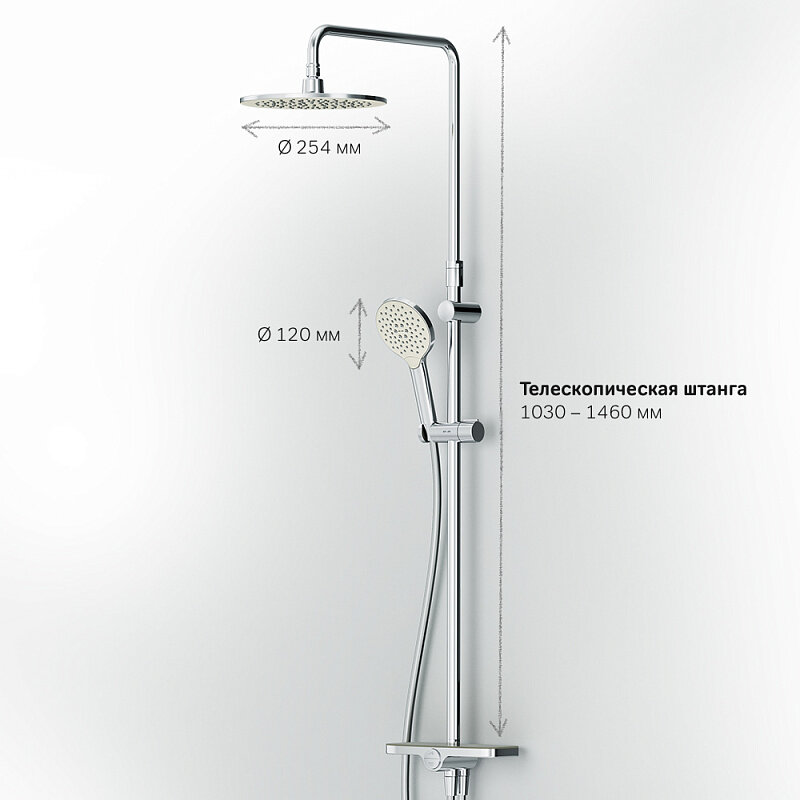 Премиальные размеры и продуманные детали: увеличенный диаметр душевых леек (верхний душ 220 мм и ручной душ 120 мм) позволит ощутить преимущества тропического душа, тогда как увеличенная длина шланга 1750 мм обеспечит свободу движений во время принятия душа. Телескопическая поворотная штанга регулируется по высоте в диапазоне от 1030 до 1460 мм, обеспечивая комфорт для людей любого роста, а шаровой шарнир в держателе верхнего душа позволяет регулировать угол его наклона.