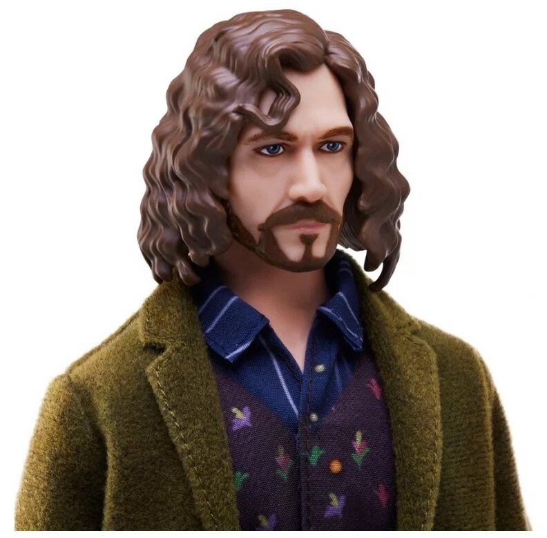 - Коллекционная кукла создана по образу Сириуса Блэка и одета в костюм персонажа: полосатую рубашку, жилет с принтом, оливковый пиджак и черные брюки.