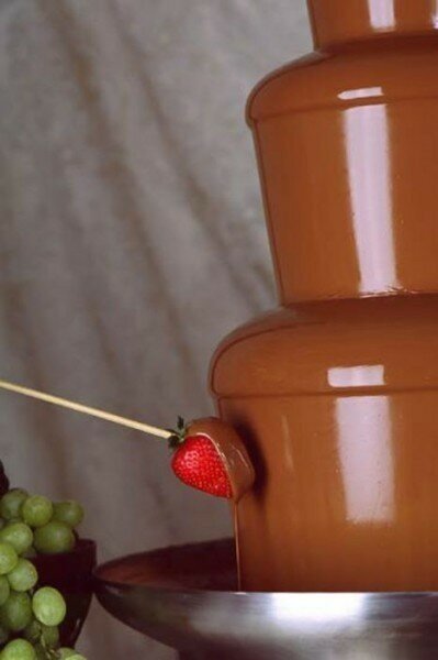 Фонтан для шоколада Gastrorag применяется для эффектной подачи шоколада на банкетах, фуршетах или детских праздниках. Возможно создавать вкуснейшие десерты, окуная фруктовые канапе в шоколадную массу. Фонтан имеет 3 яруса. Конструкция выполнена из пластмассы и нержавеющей стали. Шнековый тип фонтана. Емкость чаши составляет 1 кг. В нижней части прибора (под чашей) располагается нагревательный элемент, поддерживающий температуру. В этой чаше шоколад доводится до состояния текучести. Расплавленная шоколадная масса подается на верхний уровень башни фонтана при помощи винтового вращающегося шнека, находящегося внутри башни. Сверху шоколад стекает свободным потоком и вновь попадает на нагревающуюся чашу, где его температура вновь доводится до необходимой величины.