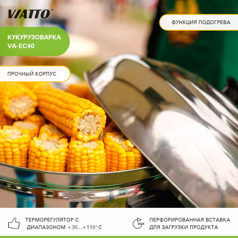 Пароварка Viatto предназначена для приготовления на пару кукурузы в початках и зернах на предприятиях общественного питания и торговли. Приготовленная таким образом кукуруза получается не только сытной, но и полезной, сохраняет яркий вкус и аромат. Корпус выполнен из нержавеющей стали. Вместимость: початки: 8 шт., зерна: 8 кг.