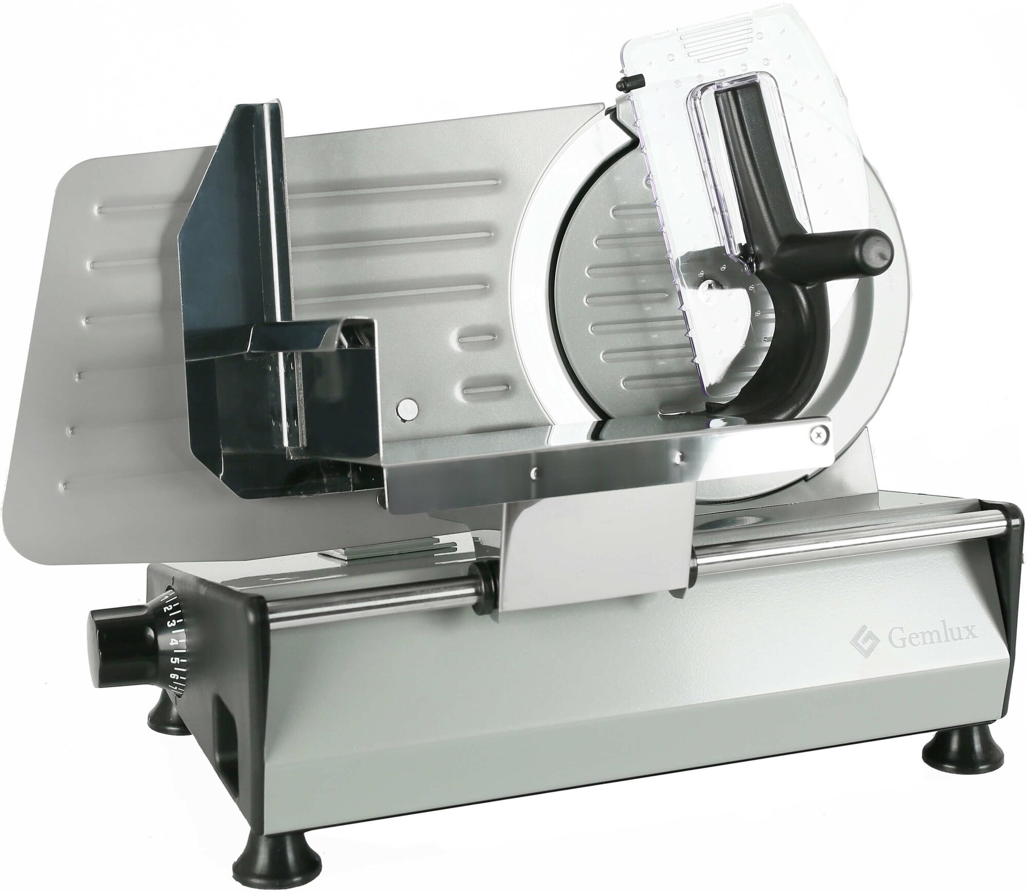 Слайсер Gemlux применяется для нарезки мяса, сыра, колбасных изделий и других продуктов питания на ровные и равные ломтики. Корпус изготовлен из нержавеющей стали. Материал корпуса - окрашенный металл. Ручное перемещение каретки.
