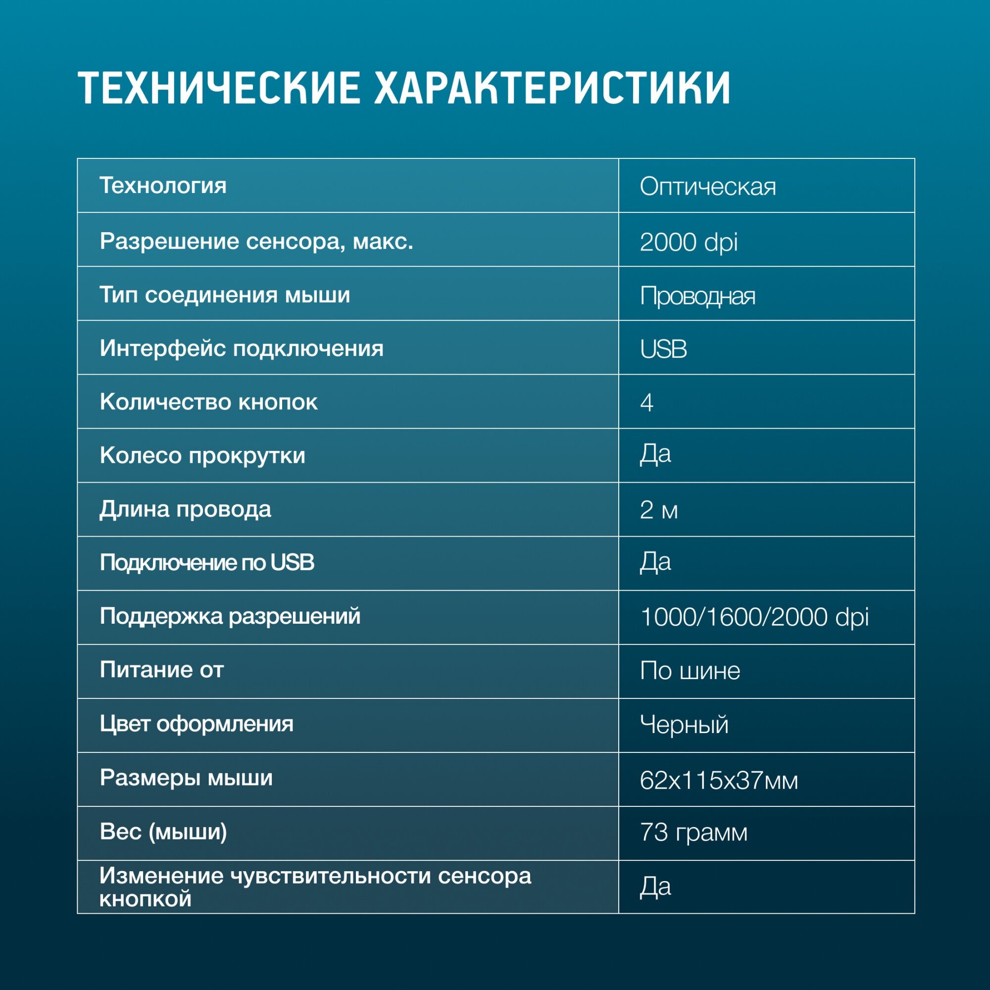 Универсальная компьютерная мышь с настраиваемым оптическим разрешением от 1000 до 2000 dpi. Длинный провод 2 м позволяет подобрать удобное рабочее расстояние до монитора или системного блока/ноутбука. Кнопка изменения оптического разрешения. Удобная полностью симметричная форма для правой и для левой руки. Качественный пластик. Оптическое разрешение оптимизировано для современных мониторов и позволяет решать не только офисные или графические задачи, но и использовать данную мышь в играх.