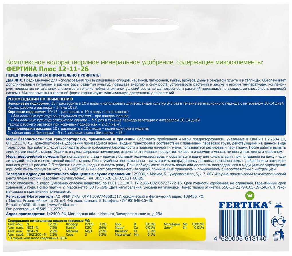 - Полностью водорастворимое комплексное азотно-фосфорно-калийное удобрение, содержащее микроэлементы.