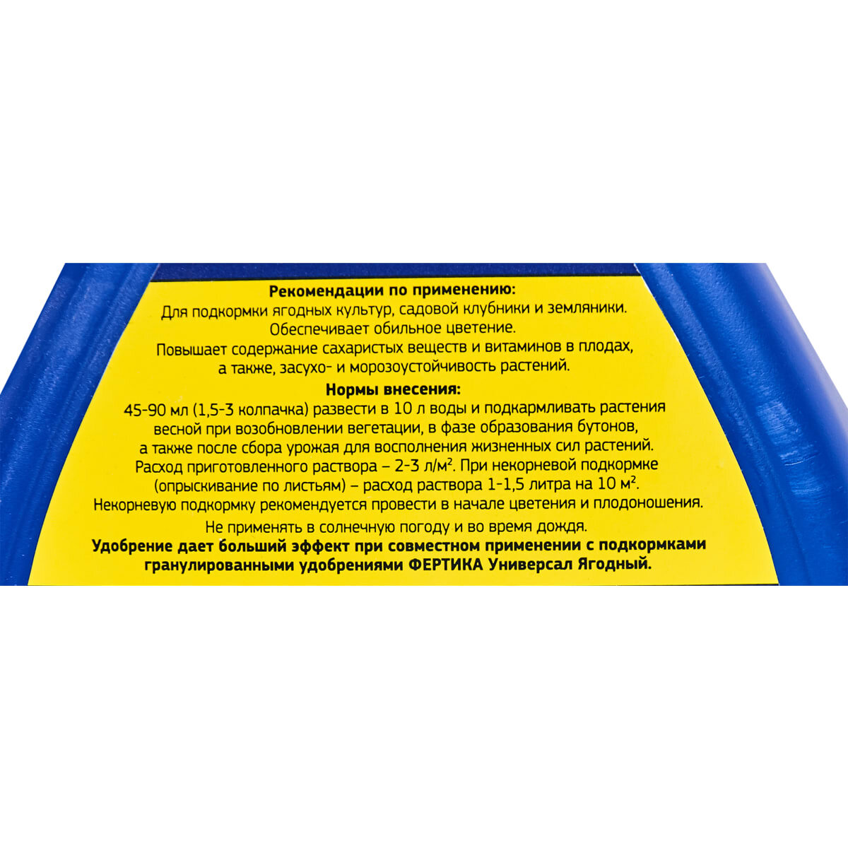 | Особенности | Для подкормки ягодных культур, садовой клубники и земляники. Обеспечивает цветение особенно при использовании для осенних подкормок. Повышает содержание сахаристых веществ и витаминов в плодах. |