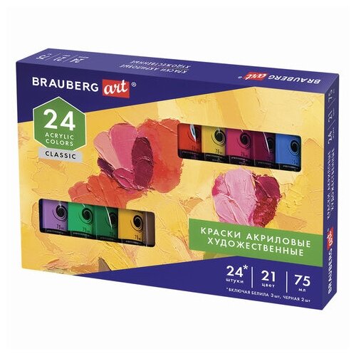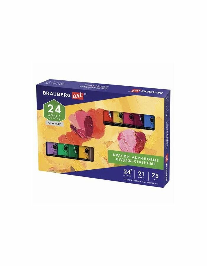 Краски акриловые 24 шт./21 цветов 75 мл туба картонная коробка BRAUBERG CLASSIC (191762) Краски акриловые художественные Classic 21 цвет