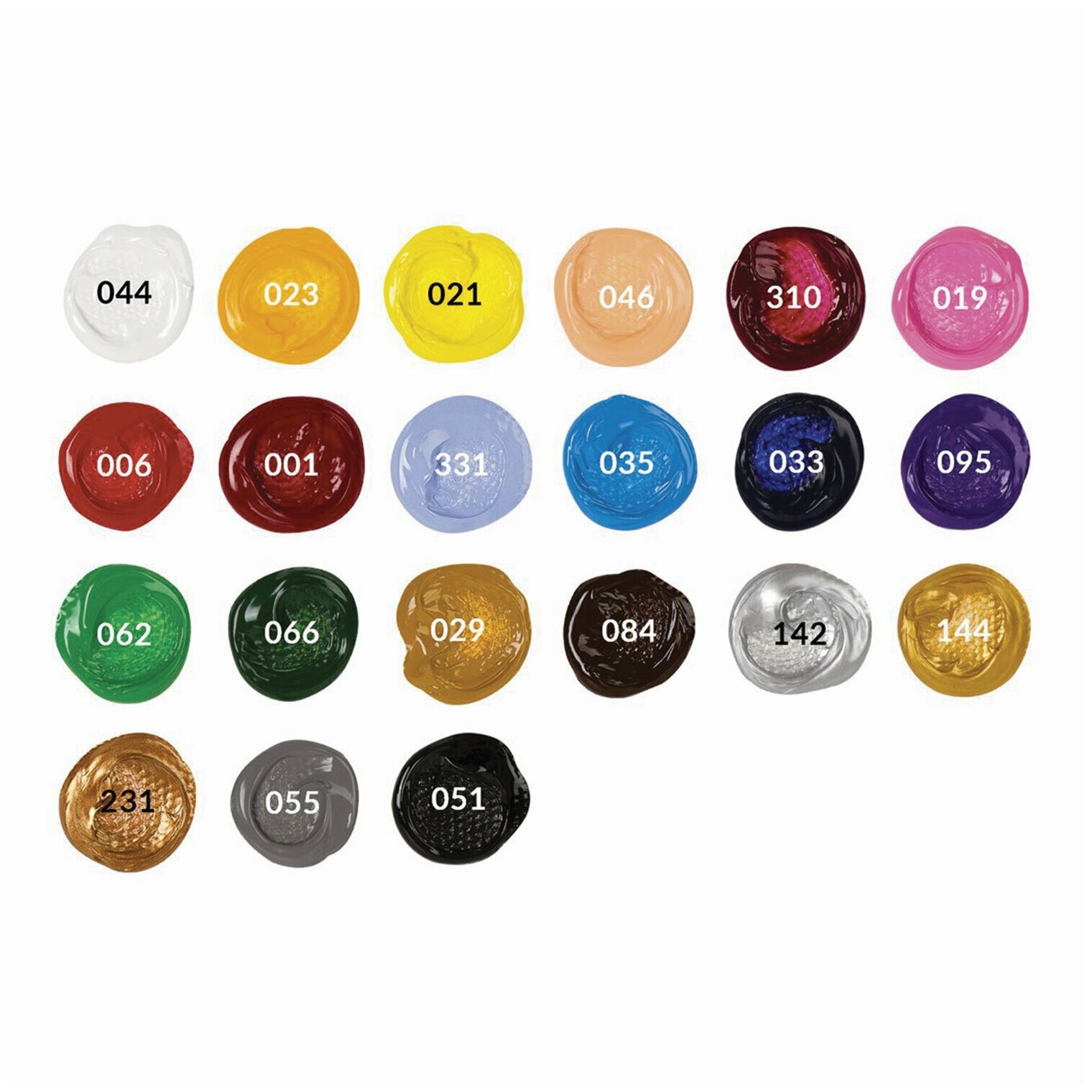 | Маркетинговый цвет | белила титановые (044) 3 шт.; лимонная желтая (021); желтая средняя (023); телесная (046); розовая светлая (019); розовая (310); киноварь (006); красная темная (001); серо-голубая светлая (331); небесно-голубая (033); ультрамарин (033); фиолетовая средняя (095); зеленая светлая (062); травяная зеленая (066); охра желтая (029); умбра жженая (084); серебристая (142); золотистая (144); перламутровая медно-золотая (231); серая (055); черная (051) 2 шт. |