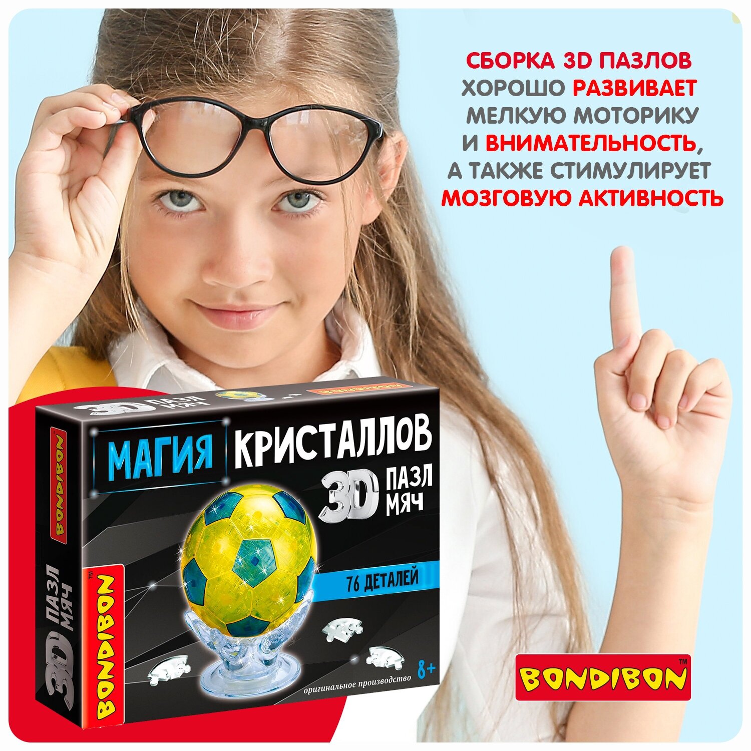 Пазл 3D "Футбольный мяч" с подсветкой из серии Магия кристаллов Bondibon - это необычный набор с полупрозрачными деталями, с помощью которых можно создать фигуру в виде кристалла. Процесс сборки отлично развивает логику, пространственное мышление, внимание и мелкую моторику. Собирать можно как самостоятельно, так и всей семьей - так будет даже интереснее! Разложите детали в порядке, который указан в инструкции и начинайте скреплять их - Вам не понадобятся ни ножницы, ни клей.