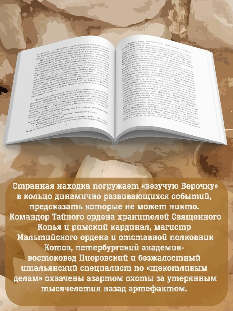 Археолог Вера Буковская при раскопках монастыря в Армении обнаруживает кусок льняной ткани с непонятными надписями и чертежом. Странная находка погружает "везучую Верочку" в кольцо динамично развивающихся событий, предсказать которые не может никто. Командор Тайного ордена хранителей Священного Копья и римский кардинал, магистр Мальтийского ордена и отставной полковник Котов, петербургский академик - востоковед Пиоровский и безжалостный итальянский специалист по "щекотливым делам" охвачены азартом охоты за утерянным тысячелетия назад артефактом. История и современность пересекаются и переплетаются, расходятся и соединяются, переносятся из Армении в Петербург, в Рим и обратно. Неожиданные озарения сменяются разочарованиями, множатся кровавые преступления и ритуальные убийства, а главных героев настигает любовь.