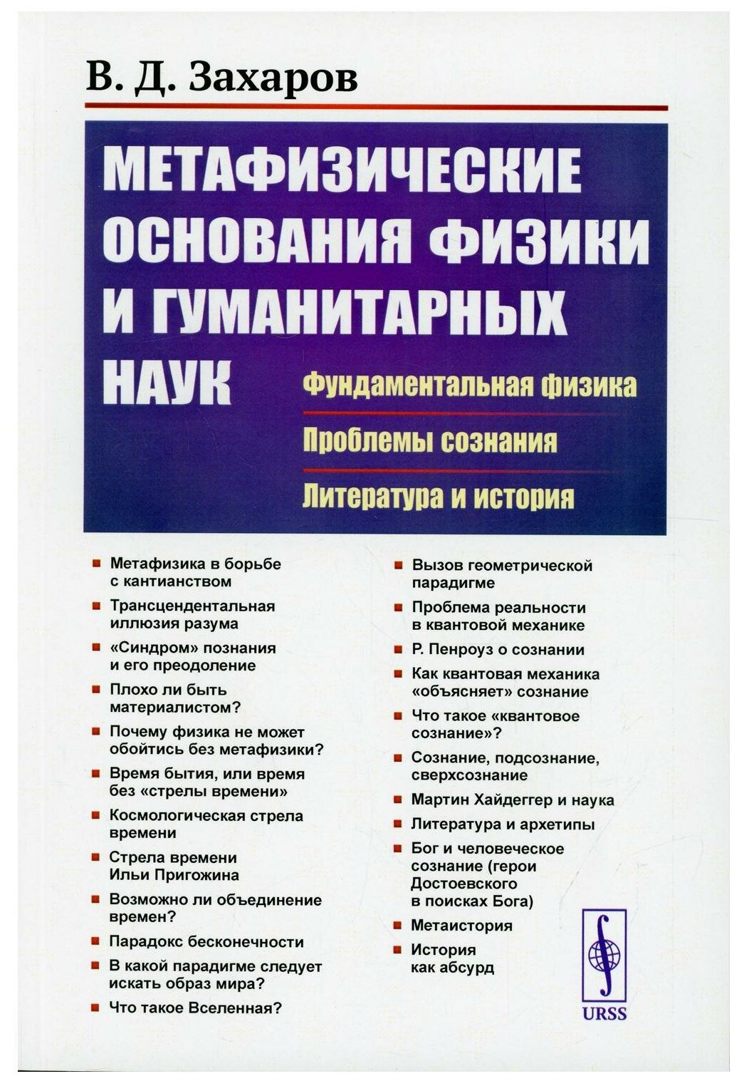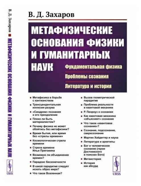 В книге известного отечественного физика-теоретика В. Д. Захарова представлены его работы, посвященные метафизическому анализу оснований фундаментальной физики, самой философии, религии, истории, природы сознания, а также гуманитарных наук. Книга состоит из четырех частей. В разделах первой части изложен метафизический подход автора к описанию физического мироздания. В разделах второй части показывается неразрывное единство исследований оснований физики и метафизики. Особое внимание уделено обсуждению содержания и проблем общей теории относительности, в частности космологии и роли систем отсчета в теории гравитации. В третьей части с позиций метафизики обсуждается роль сознания в квантовой механике и наоборот — роль квантовой механики в структуре сознания. В разделах четвертой части представлен взгляд автора на архетипы литературы в работах Шекспира, Пушкина, Достоевского и других великих писателей. Книга рекомендуется как профессиональным физикам, философам, литературоведам, так и широкому кругу читателей, интересующихся основаниями наших представлений о мироздании.