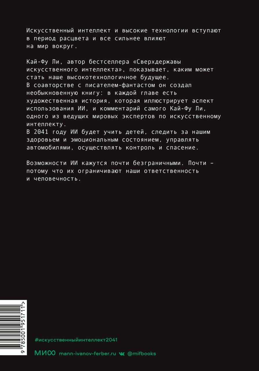 В этой провокационной, совершенно оригинальной работе Кай-Фу Ли, бывший президент Google China и автор книги «Сверхдержавы искусственного интеллекта», объединяется со знаменитым романистом Чэнь Цюфанем, чтобы представить наш мир в 2041 году и то, как он будет формироваться с помощью ИИ. В десяти захватывающих рассказах они познакомят читателей с возможными новыми реалиями 2041 года: