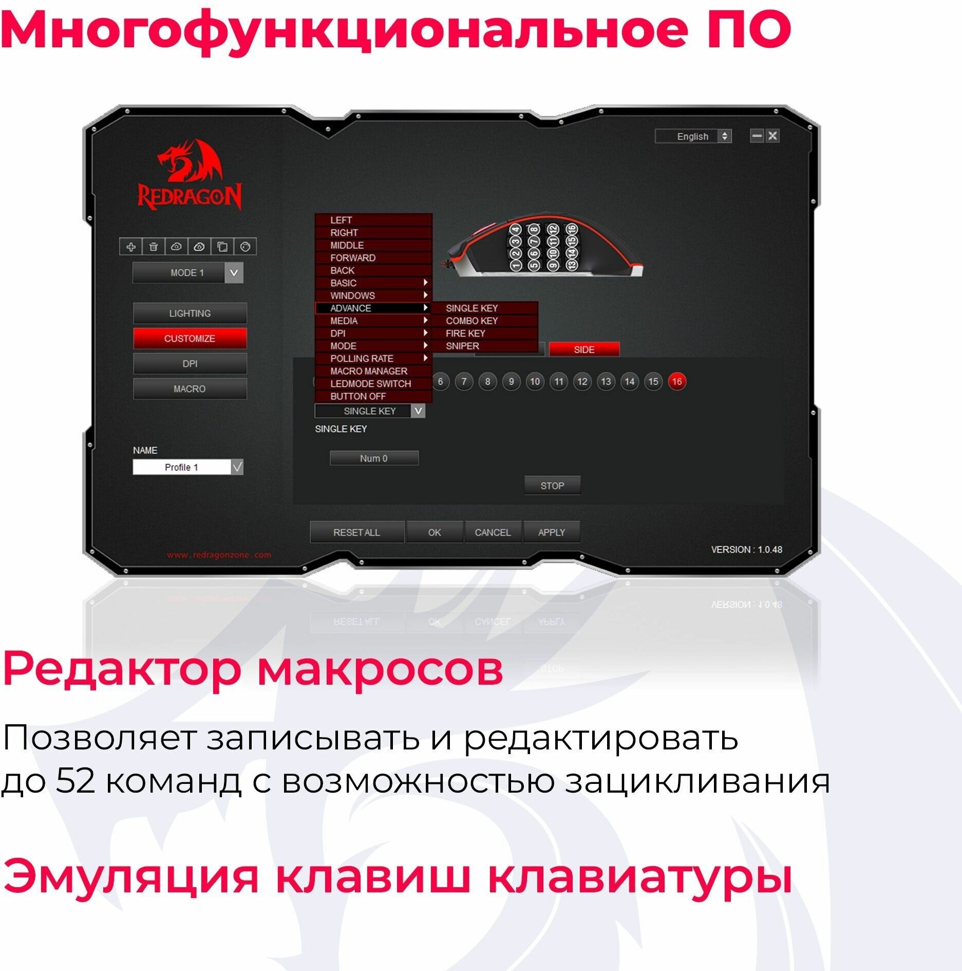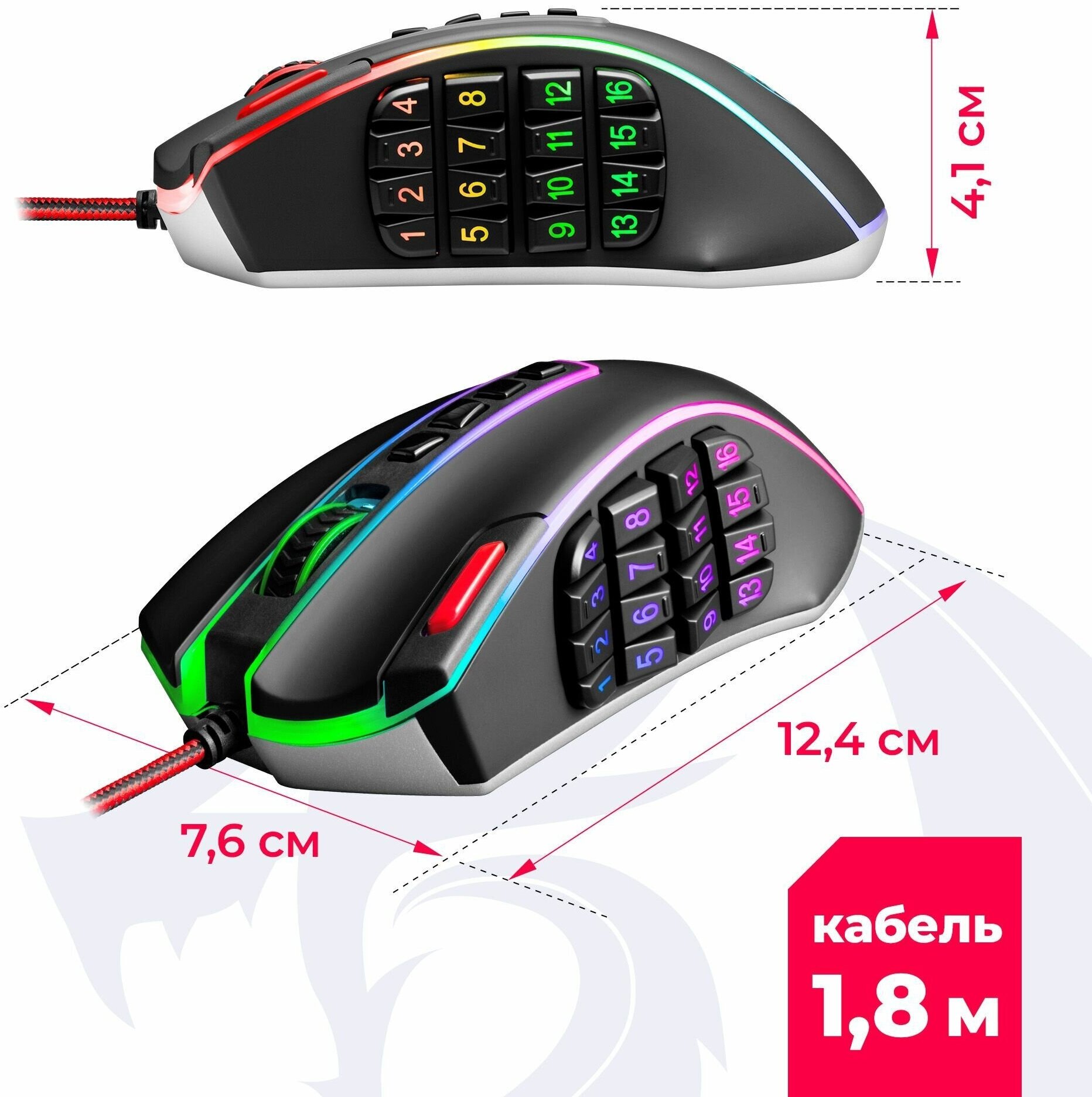 | Прочее | Подсветка есть, Тип подсветки RGB, MTBF 20000000 кликов, Особенности Профессиональная игровая мышь с RGB подсветкой специально адаптированная для использования в RPG играх. Улучшенный сенсор, легкая регулировка веса, в том числе, изменение центра тяжести, 16 кнопок с подсветкой под большим пальцем, 2 дополнительные верхние и кнопка под указательный палец. |