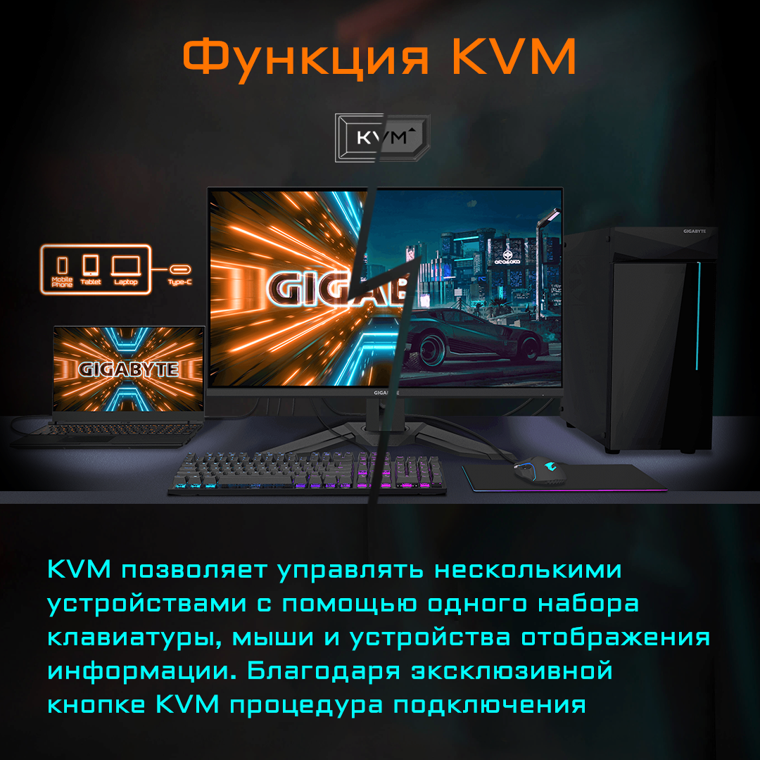 Монитор Gigabyte - это устройство, которое сочетает в себе качество, функциональность и стиль.Монитор оснащен VA-матрицей с диагональю 31,5 дюйма и радиусом кривизны 1500R. Это создает необходимые условия для полного погружения в атмосферу кинофильма или игрового процесса, комфортного просмотра и быстрой адаптации зрения.Функция KVM позволяет управлять несколькими устройствами с помощью одного набора клавиатуры, мыши и устройства отображения информации. Благодаря эксклюзивной кнопке KVM процедура подключения и идентификации устройств стала намного проще! Буквально, в одно касание!Эксклюзивный помощник GIGABYTE OSD Sidekick позволит оперативно настроить параметры дисплея с помощью клавиатуры и мыши. Пользователь сможет быстро отрегулировать все ключевые настройки дисплея, не прибегая к помощи кнопок на мониторе.Конструктив эргономичной стойки на прочном основании обеспечивает необходимый диапазон регулировок игровых мониторов GIGABYTE по высоте и наклону.Монитор Gigabyte оснащен рядом интерфейсов, включая HDMI, DisplayPort и USB Type-C (альтернативный режим). Также имеется HDMI-хаб и USB-концентратор.Монитор поддерживает стандарты HDR, FreeSync Premium Pro и G-Sync Compatible.Монитор имеет черный цвет корпуса и подставки, что делает его стильным дополнением к любому интерьеру.В комплект поставки входят кабели питания, HDMI, DisplayPort, USB, краткое руководство пользователя и гарантийный талон.Выбирая монитор Gigabyte , вы получаете высококачественное устройство, которое обеспечит комфорт и удобство в использовании.
