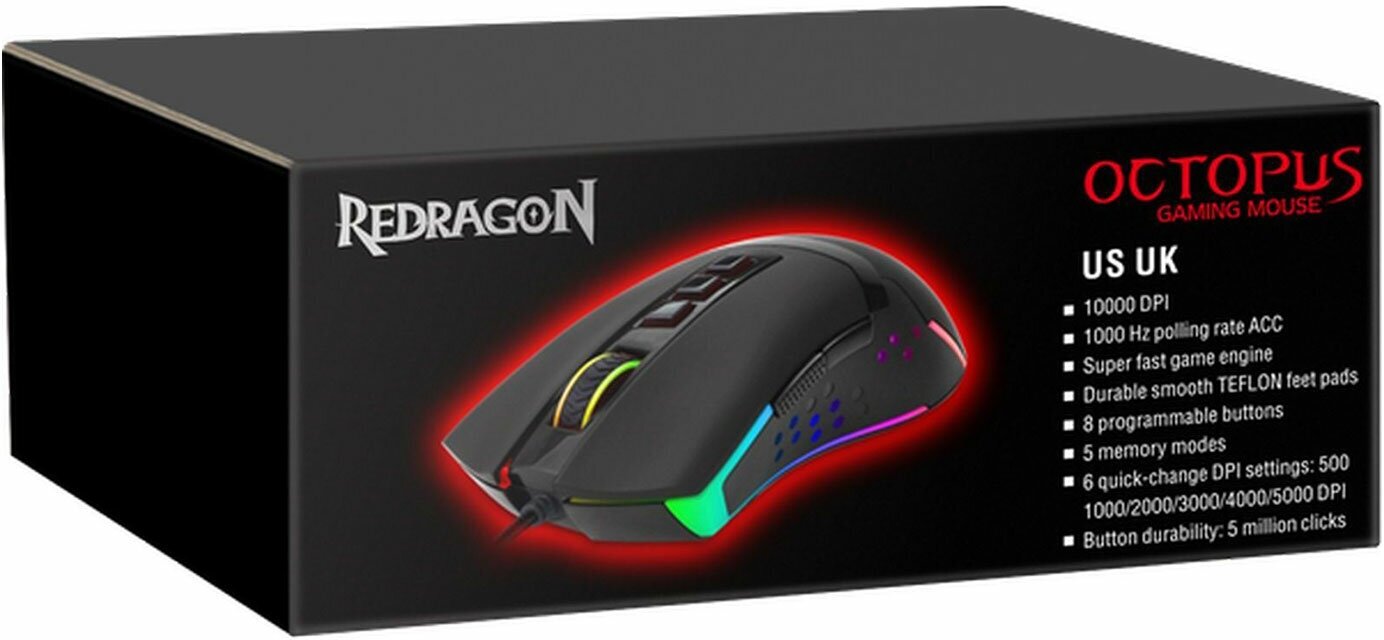 Название Мышь Redragon Octopus. Категория Мыши. Цвет черный. Тип игровая мышь. Вертикальная нет. Назначение настольный компьютер. Интерфейс подключения USB. С подсветкой есть. Принцип работы оптическая светодиодная. Дизайн для правой руки. Колесо прокрутки есть. Количество клавиш 9. Количество программируемых клавиш 8. Частота опроса 1000 Гц. Разрешение оптического сенсора 10000 dpi. Длина провода 1.8 м. Размеры (ШxВxД) 66x41x127 мм. Особенности удлиненные тефлоновые ножки, сохранение профилей, редактор макросов.