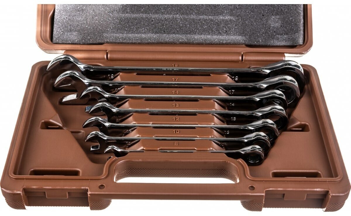 Набор комбинированных трещоточных ключей 7 шт Ombra SNAP GEAR 935007 сочетает в себе семь прочных, качественных и надежных ручных инструментов различных по размеру. Набор используется в различных автомастерских для ремонта и обслуживания автомобилей. Каждый ключ имеет двустороннее применение.Преимущества Малый, 5°, обратный ход делает ключ незаменимым в ограниченном рабочем пространстве Храповой механизм “SNAP GEAR”, с колесом в 72 зуба, обеспечивает достаточно высокий передаваемый крутящий момент благодаря закаленной особым способом хромованадиевой стали, применяемой при производстве механизма Ключ изготовлен по стандарту ANSI, имеет трехслойное хромоникелевое покрытие, зеркально отполирован Все компоненты надежно упакованы в пластиковый закрывающийся кейс, который удобен при хранении и транспортировке инструментов