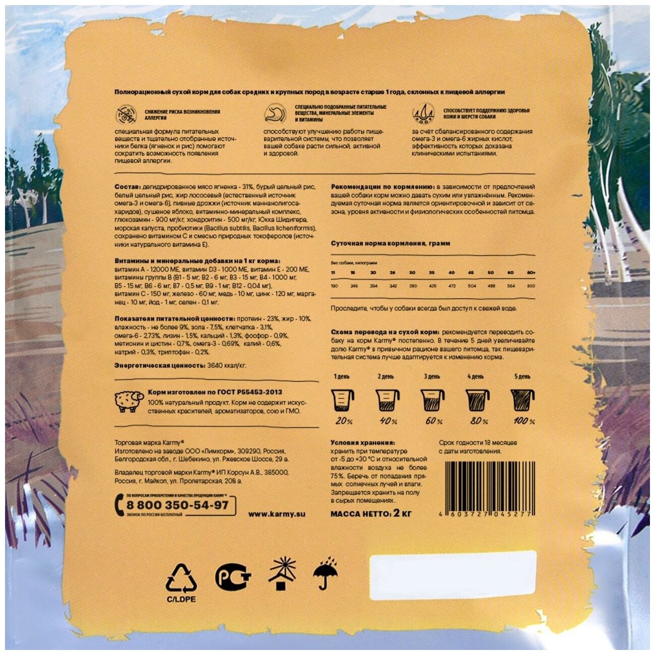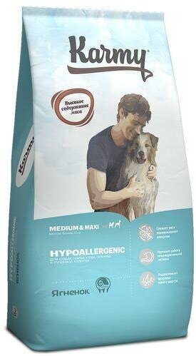 Karmy с ягненком гипоаллергенный. Сухой корм Karmy с ягненком предназначен для взрослых собак средних и крупных пород склонных к пищевой аллергии. По ингредиентному составу относится к кормам премиум класса. Специальная формула питательных веществ и тщательно отобранные источники белка (ягнёнок и рис) помогают сократить возможность появления пищевой аллергии. Минеральные элементы и витамины способствуют улучшению работы пищеварительной системы, что позволяет вашей собаке оставаться сильной, активной и здоровой.