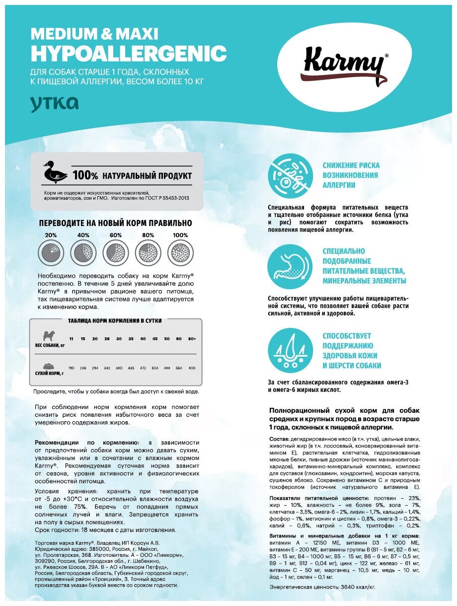 Karmy с уткой - гипоаллергенный полнорационный сухой корм. Предназначен для питания взрослых собак от 1 года, средних и крупных пород склонных к пищевой аллергии.