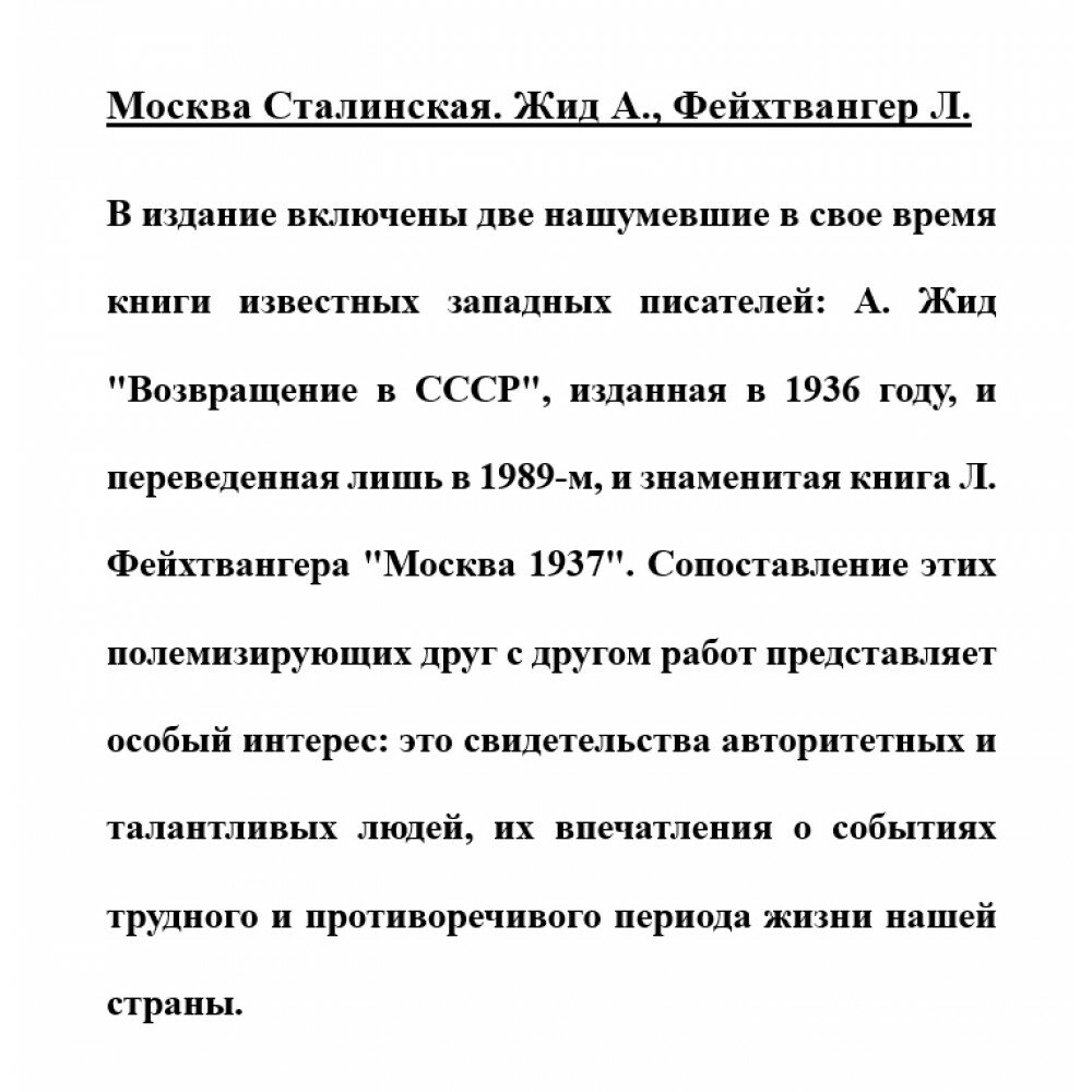 В издание включены две нашумевшие в свое время книги известных западных писателей: А. Жид "Возвращение в СССР", изданная в 1936 году, и переведенная лишь в 1989-м, и знаменитая книга Л. Фейхтвангера "Москва 1937". Сопоставление этих полемизирующих друг с другом работ представляет особый интерес: это свидетельства авторитетных и талантливых людей, их впечатления о событиях трудного и противоречивого периода жизни нашей страны