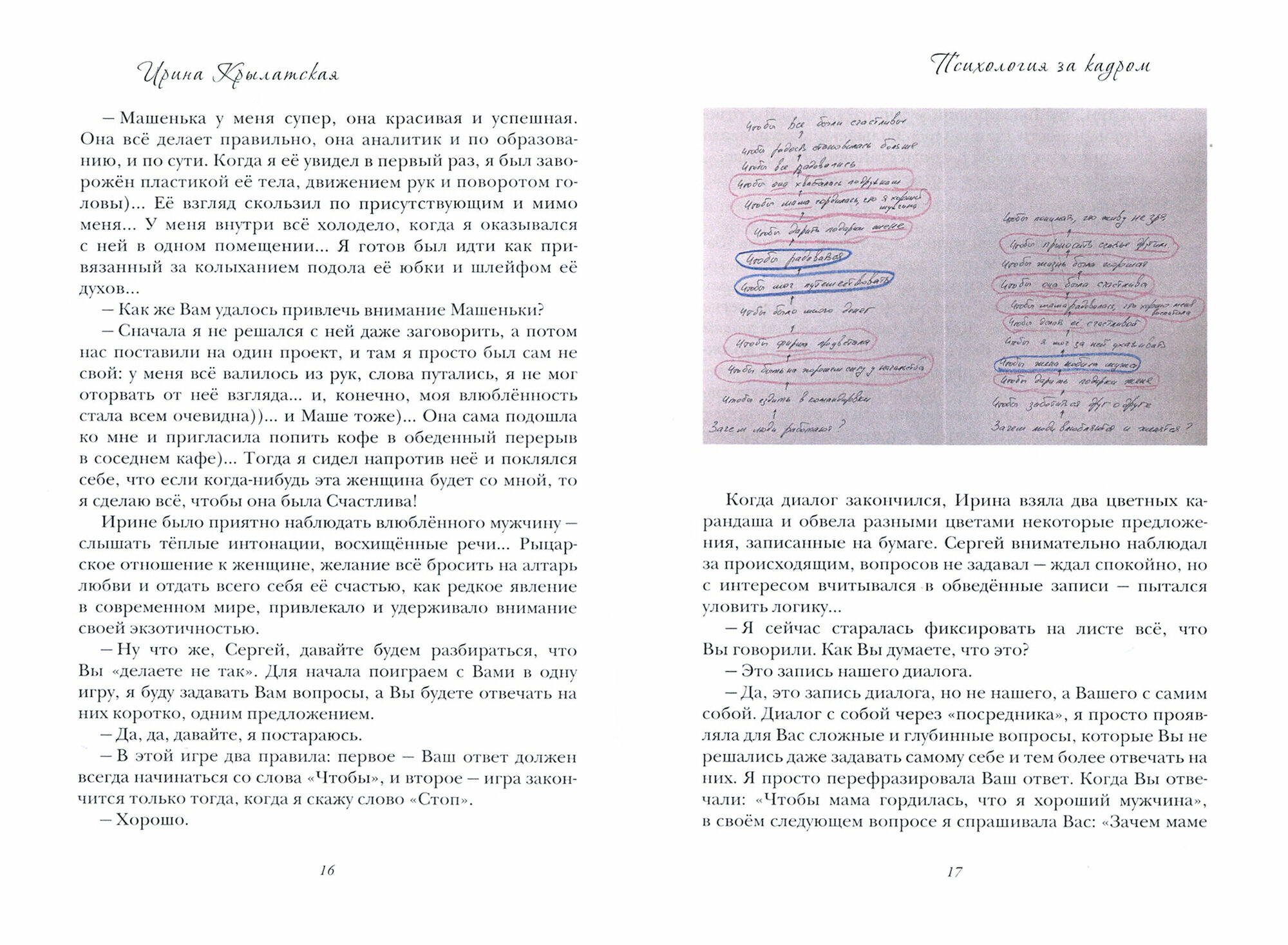 Практикующий психолог встречается со своими клиентами. Одна встреча - один сюжет. В сюжете психолог, используя различные методики, изучает кризисную ситуацию клиента и помогает ему определить направление выхода. На фоне историй, основанных на реальных случаях из практики, автор описывает то, что обычно остается за кадром работы психолога - итоги многочасовых размышлений, анализа, поиска и реализация индивидуального подхода к клиенту. При этом автор дает возможность читателю в моменты сопереживания герою каждого сюжета "превратиться" в психолога и разглядеть историю до и после. В книге использованы иллюстрации - рабочие материалы конкретных клиентов: рисунки, тексты, фотографии - для демонстрации того, как те или иные методики проявляют себя в деле.
