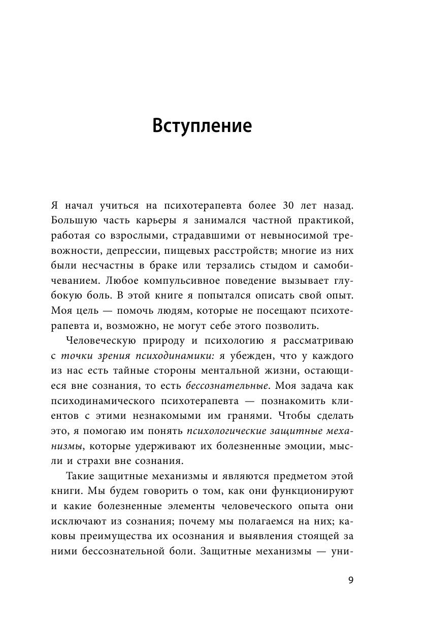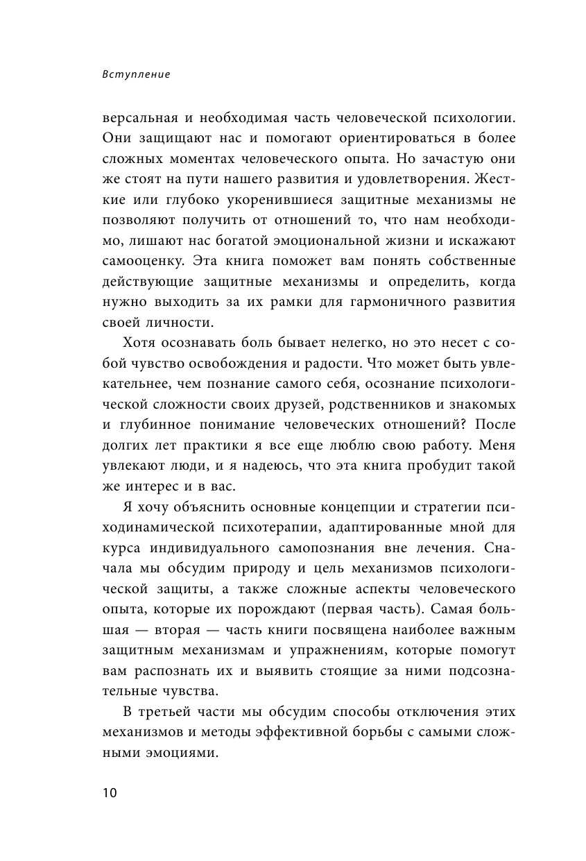 Автор рассказывает о видах психологических защит, причинах их возникновения и способах борьбы с ними. В конце глав даны задания, которые позволяют разобраться в себе и своих чувствах. В книге нет решения всех проблем, однако она позволяет тебе заглянуть в себя и выявить те моменты, с которыми тебе нужно будет бороться САМИМ. Тут нет стереотипов, инфоциганства и обещаний о прекрасной жизни. Лишь базовое понимание темы и указание направления, в котором ты сможешь двигаться, только если сам приложишь усилия.