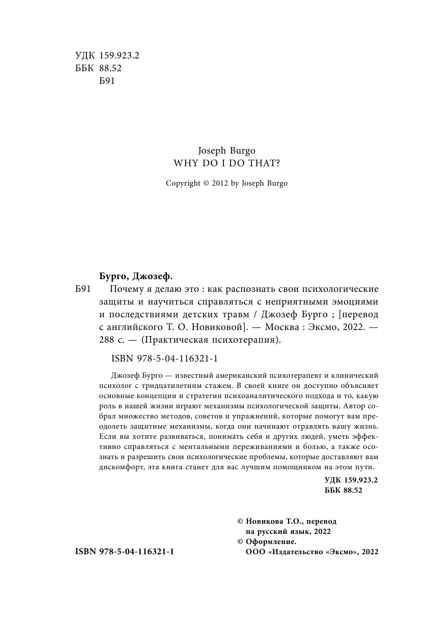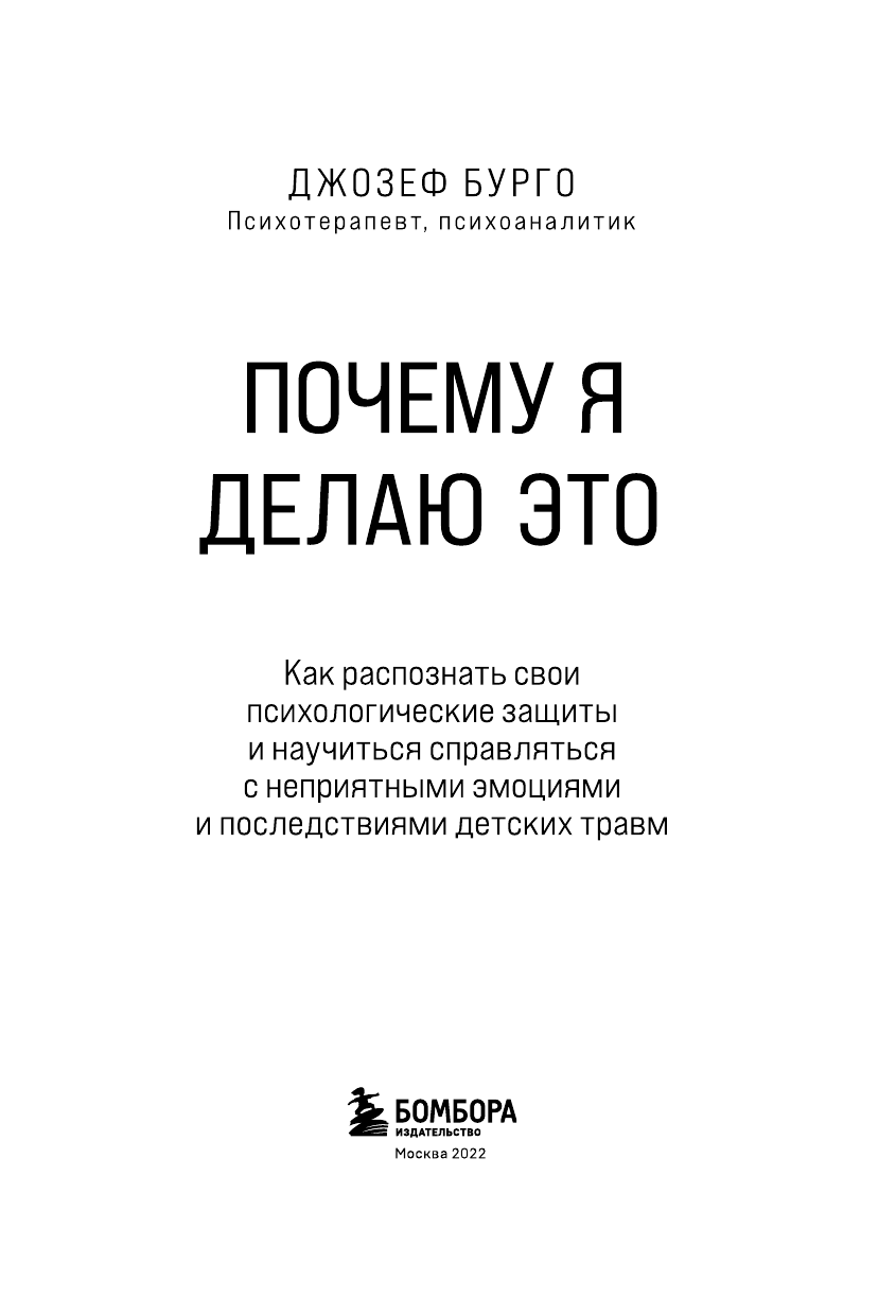 Почему я делаю это Как распознать свои психологические защиты и научиться справляться с неприятными эмоциями и последствиями детских травм (Бурго Джозеф); ООО "Издательство "Эксмо", 2022