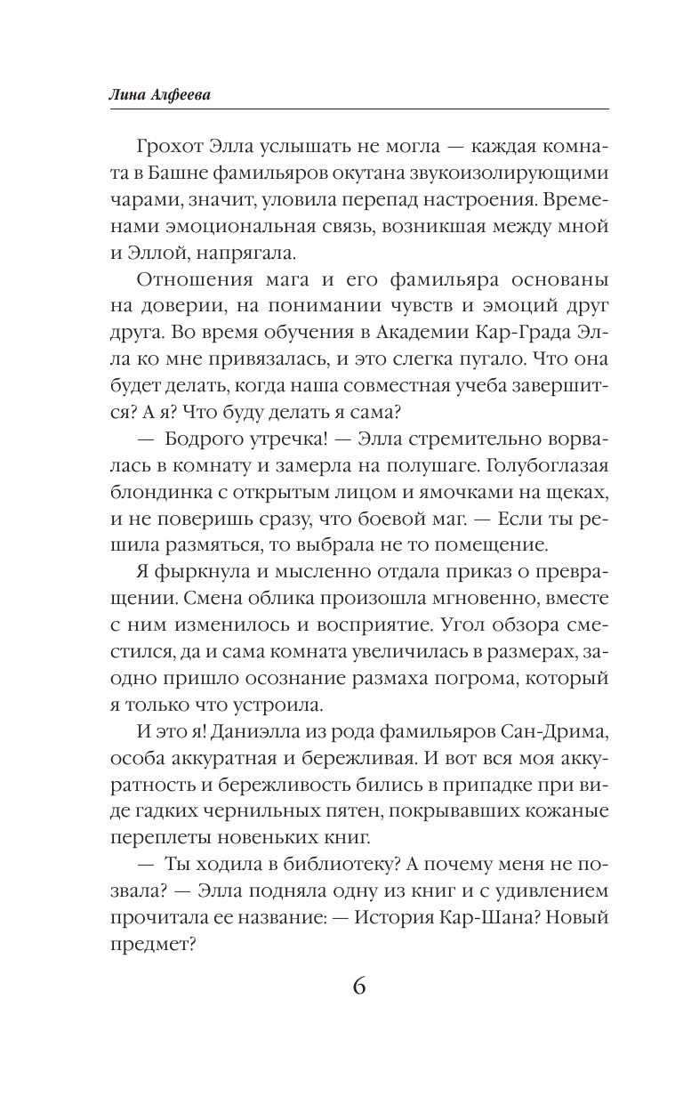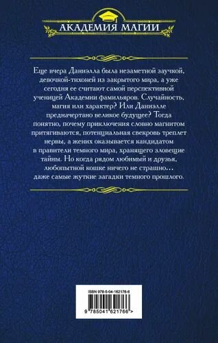 Прежде чем читать 3-ю часть "Академии фамильяров", перечитала первые две, т.к. события уже подзабылись. Вся трилогия понравилась, у автора легкий слог, да и событий во всей истории много: и учеба, и испытания, и любовная линия не только у главной героини Даниэллы, но и у Люка и Эллы, у Кеннета и Сони (вот уж неожиданно, но очень приятно.) Необычно подано происхождение фамильяров, но это право и фантазия автора. Понравился вездесущий саур - все-то он знает и помогает Даниэлле. А за Зверя я рада (в концовке он получил долгожданную свободу). Хорошая история, как и все книги Л. Алфеевой, что мне доводилось читать.