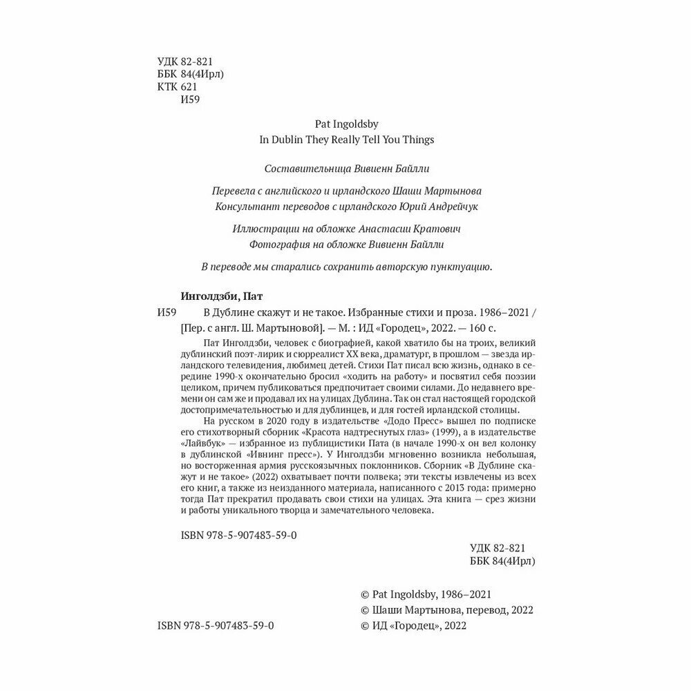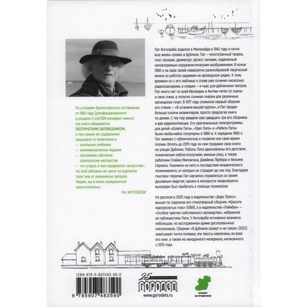 Пат Инголдзби, человек с биографией, какой хватило бы на троих, великий дублинский поэт-лирик и сюрреалист ХХ века, драматург, в прошлом — звезда ирландского телевидения, любимец детей. Стихи Пат писал всю жизнь, однако в середине 1990-х окончательно бросил «ходить на работу» и посвятил себя поэзии целиком, причем публиковаться предпочитает своими силами. До недавнего времени он сам же и продавал их на улицах Дублина. Так он стал настоящей городской достопримечательностью и для дублинцев, и для гостей ирландской столицы. На русском в 2020 году в издательстве «Додо Пресс» вышел по подписке его стихотворный сборник «Красота надтреснутых глаз» (1999), а в издательстве «Лайвбук» — избранное из публицистики Пата (в начале 1990-х он вел колонку в дублинской «Ивнинг пресс»). У Инголдзби мгновенно возникла небольшая, но восторженная армия русскоязычных поклонников. Сборник «В Дублине скажут и не такое» (2022) охватывает почти полвека;